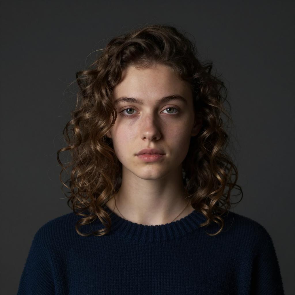 A portrait of a young woman with softly curled hair and a calm expression, wearing a dark blue knitted sweater against a dark, moody background. The image captures a classic and intimate atmosphere with rich contrast and subtle lighting that highlights her facial features and smooth complexion.