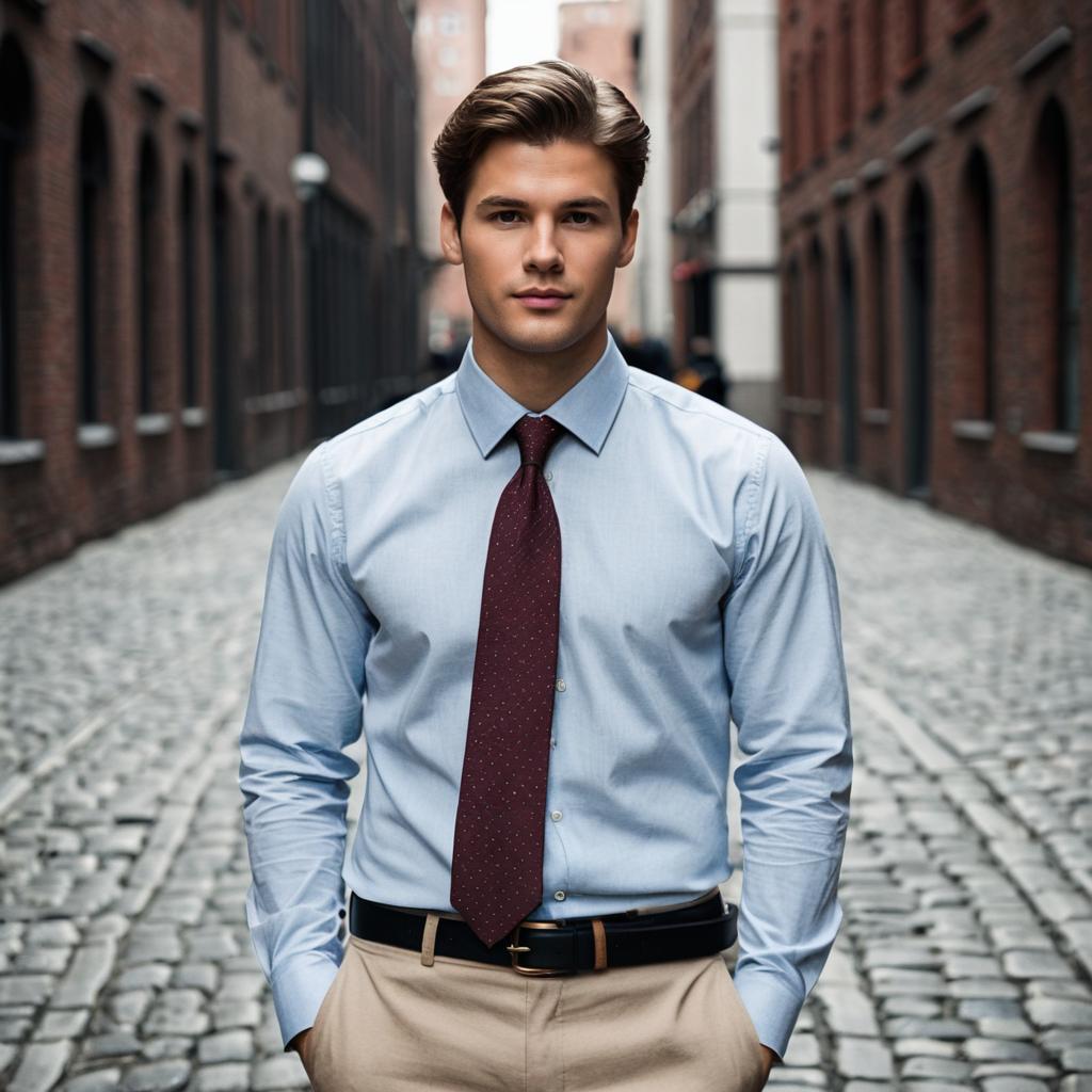 Business dress shirts, photorealistic portrait of a handsome young man with light skin, brown hair, wearing a light blue dress shirt, dark maroon tie, black belt, beige pants, standing on a cobblestone street, blurred urban background, daytime, serious expression, hands at sides, slightly overexposed, medium shot, realistic lighting, symmetrical composition