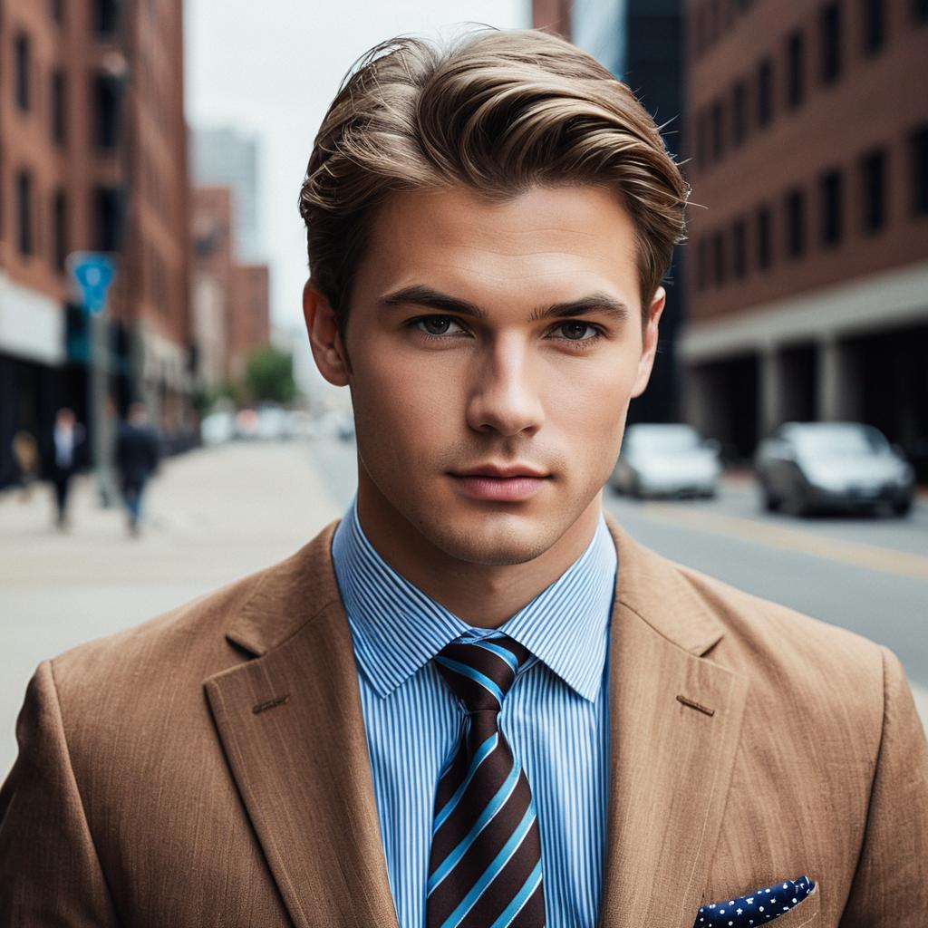 Photorealistic portrait of a handsome young man with light skin and brown hair standing on a cobblestone street in an urban setting during daytime. He is wearing a light blue dress shirt, dark maroon tie with subtle patterns, beige pants, and a black belt. The background is blurred city buildings with brick facades, emphasizing the subject's serious expression and professional attire.