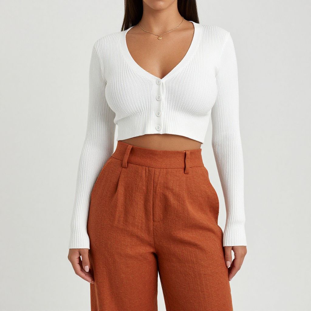 "Woman, casual chic, ribbed white cardigan with a V-neckline and front button closure, cropped at the waist, paired with high-waisted, wide-leg trousers in a burnt orange hue, textured fabric, possibly linen or a linen blend. Simple gold necklace with small pendant, natural makeup look, hair is down straight. Plain white background, likely in a. Sexy. Pretty face and beаutiful eyes. Big breasts."