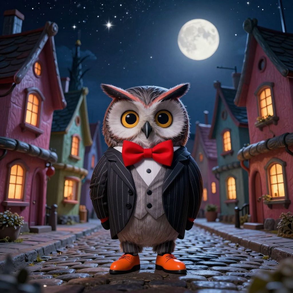Bald costume, a whimsical bald bald eagle character dressed in an old-fashioned Victorian suit with intricate embroidery, holding a cane, standing in a foggy enchanted forest with magical floating lights, highly detailed illustration.