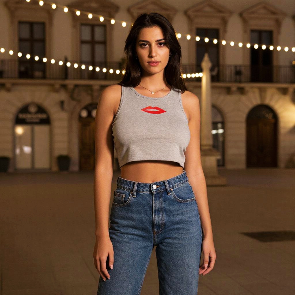 Photograph of a young woman with dark hair, wearing a gray crop top with red lips, high-waisted blue jeans, standing in front of