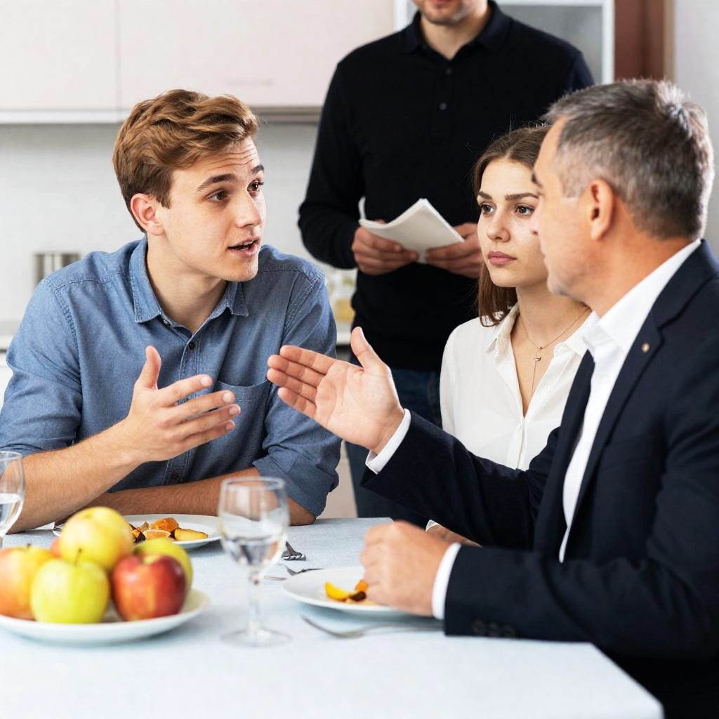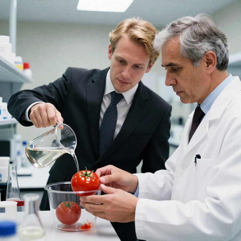 Photograph of two men in a laboratory. One man with blonde hair, in a dark suit and tie, pours liquid from a glass beaker into a clear container with red tomatoes. The other man, with gray hair and a white lab coat, looks intently at the tomatoes. Laboratory equipment and glass containers fill the background. The blonde-haired man is focused on the pouring action. The gray-haired man has a serious expression. Both men are positioned to the right, with the laboratory equipment to the left.