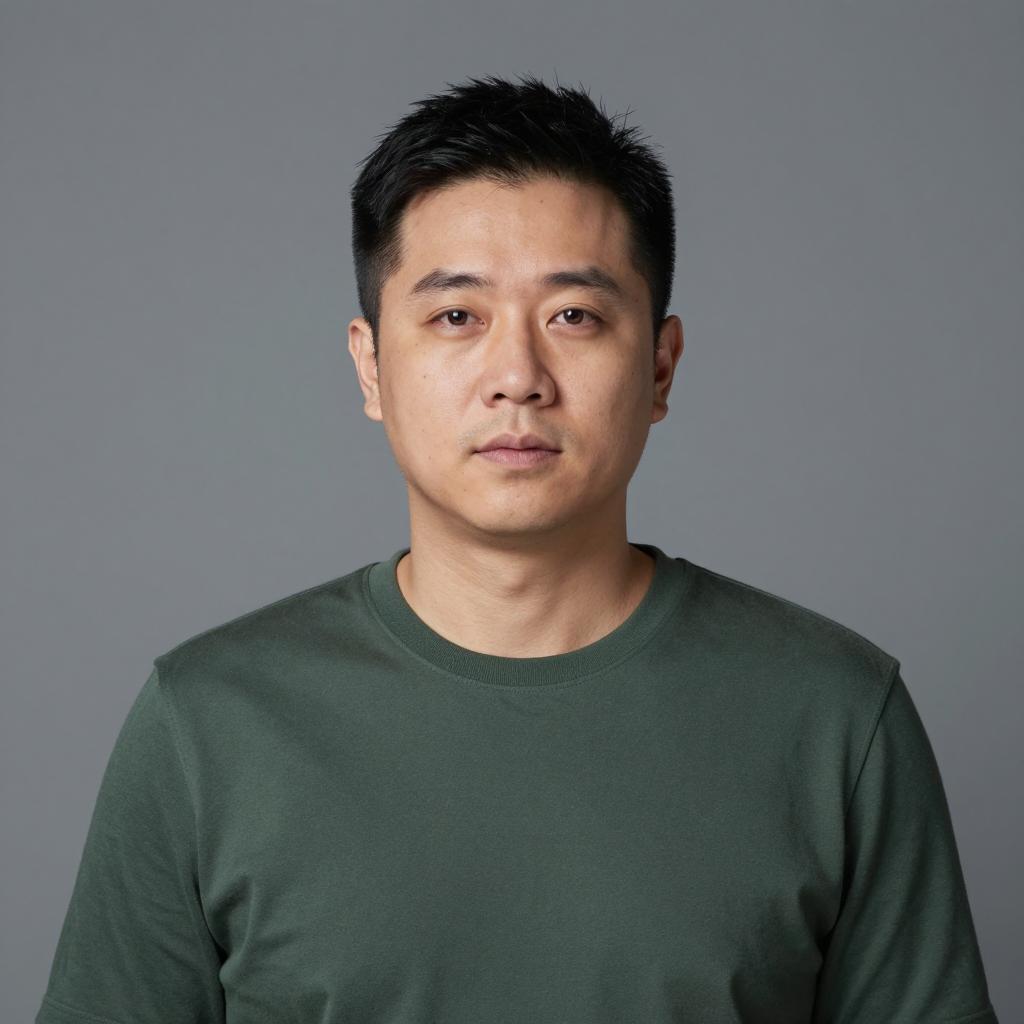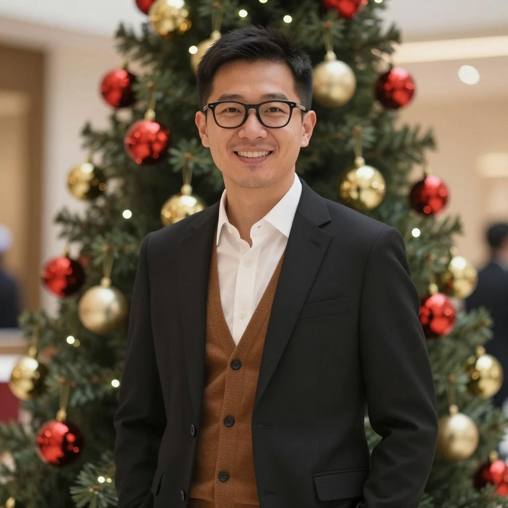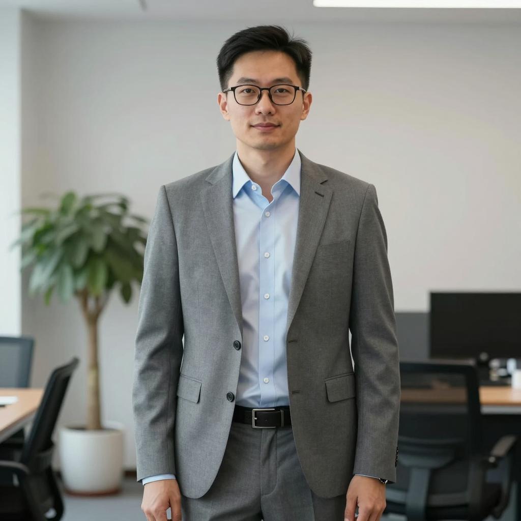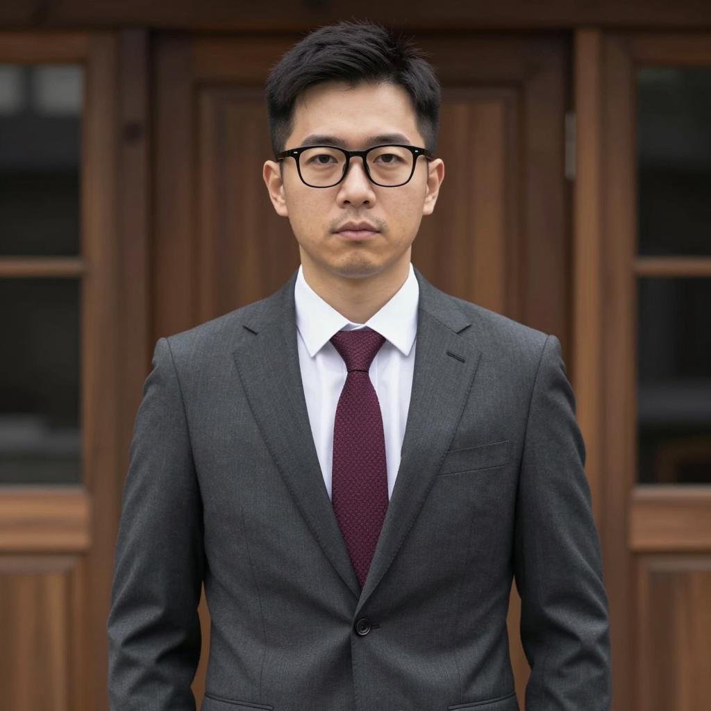Close-up photorealistic portrait of an Asian man with short black hair and glasses. He has a serious expression and is wearing a brown blazer over a white shirt. The background features green leafy foliage with a slight bokeh effect, suggesting an outdoor summer setting with natural daylight.