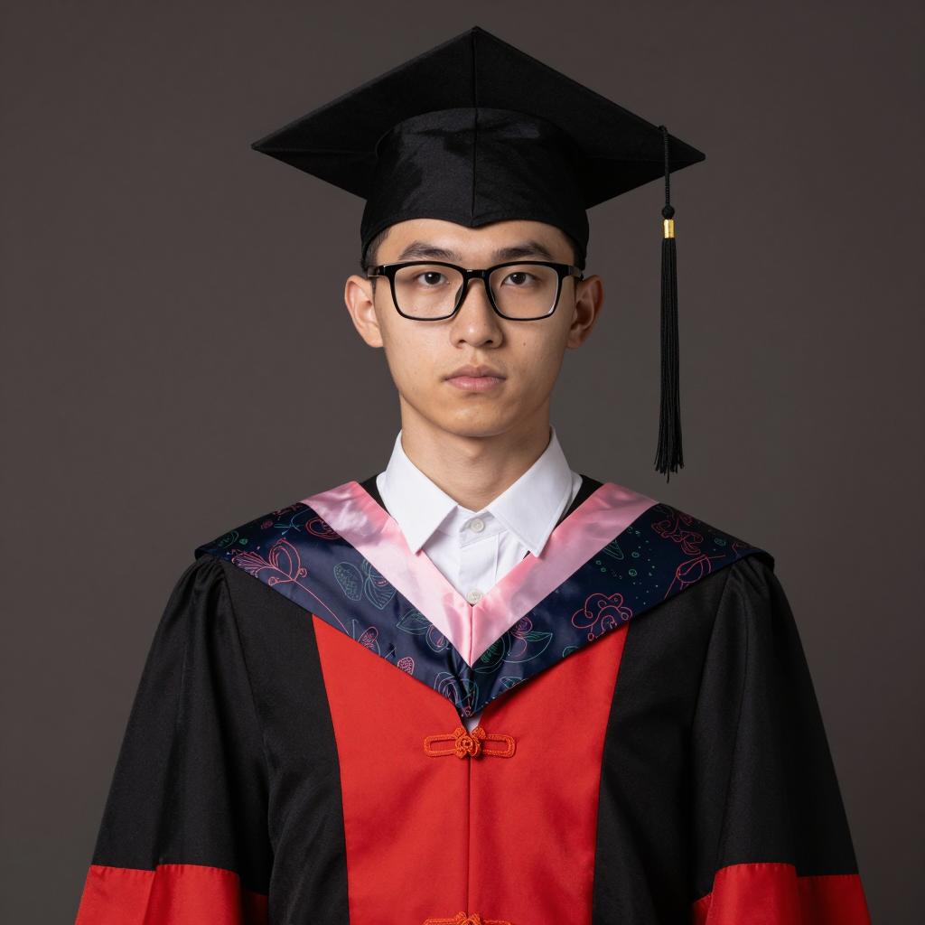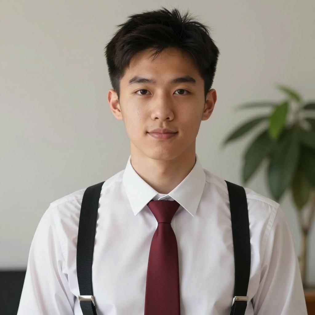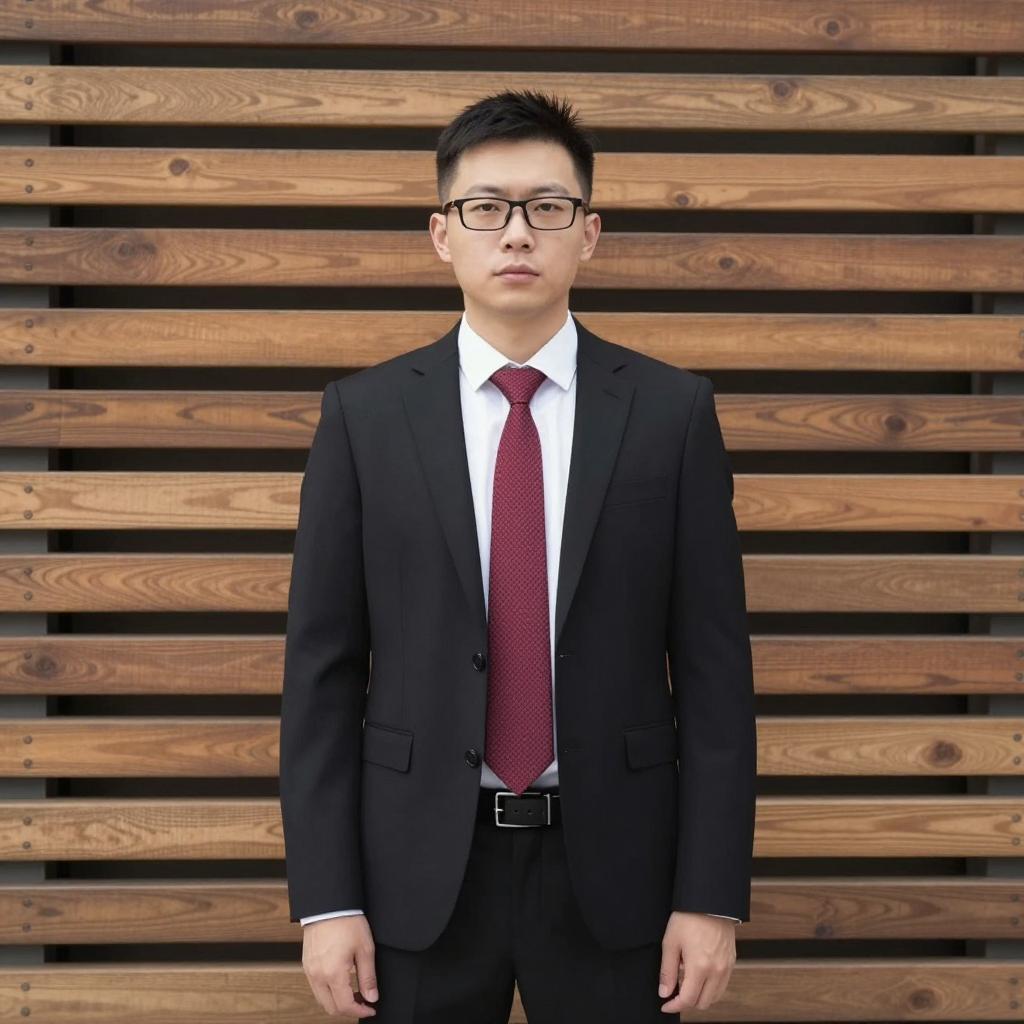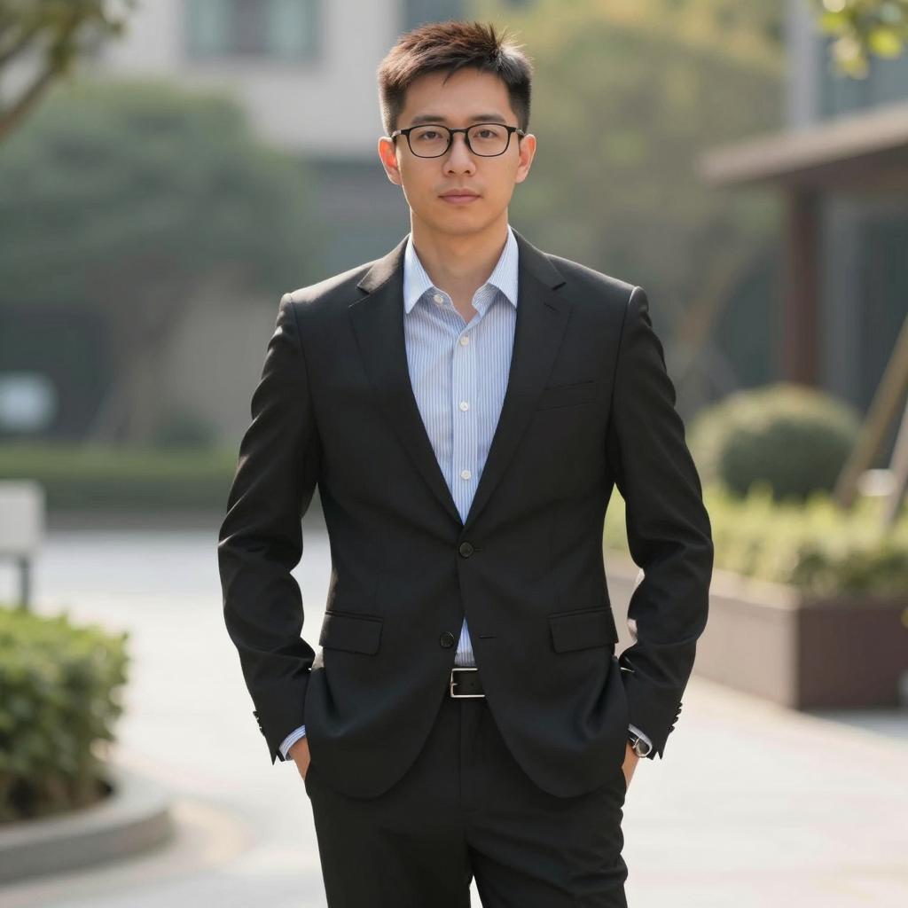 Degrees clothing costume, photorealistic portrait of an Asian man, short black hair, glasses, serious expression, wearing brown blazer over white shirt, standing in front of green leafy background, daytime, natural light, close-up, slight bokeh, vertical orientation, casual attire, outdoors, summer