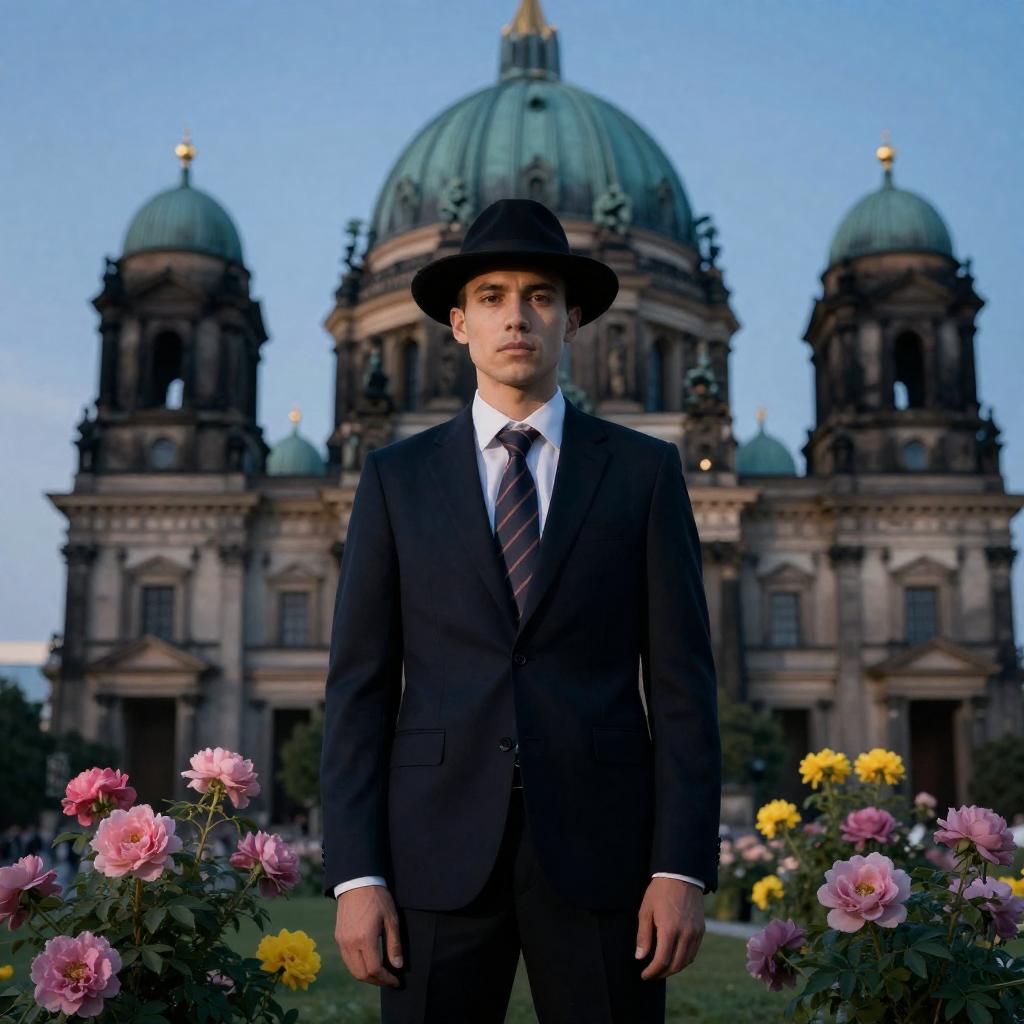 Man in dark suit, striped tie, and black hat stands in front of blooming pink and yellow flowers. Cathedral with green dome in background. Dark blue evening sky. Man's expression is serious. Two domed buildings on right.