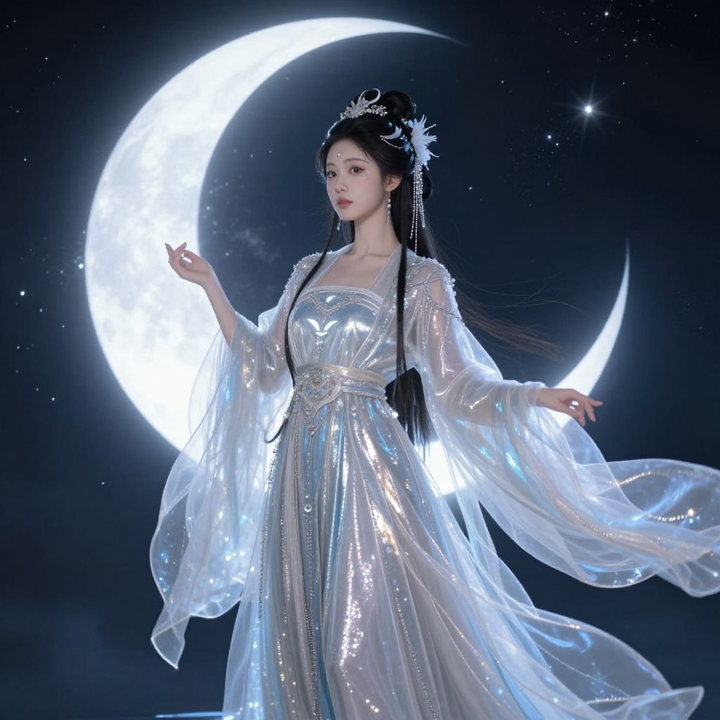 Selene moon goddess costume, ethereal flowing robe shimmering with silver and blue hues, adorned with lunar motifs and delicate crescent moon accessories, glowing softly under a starry night sky, mystical and enchanting ambiance, fantasy art style.
