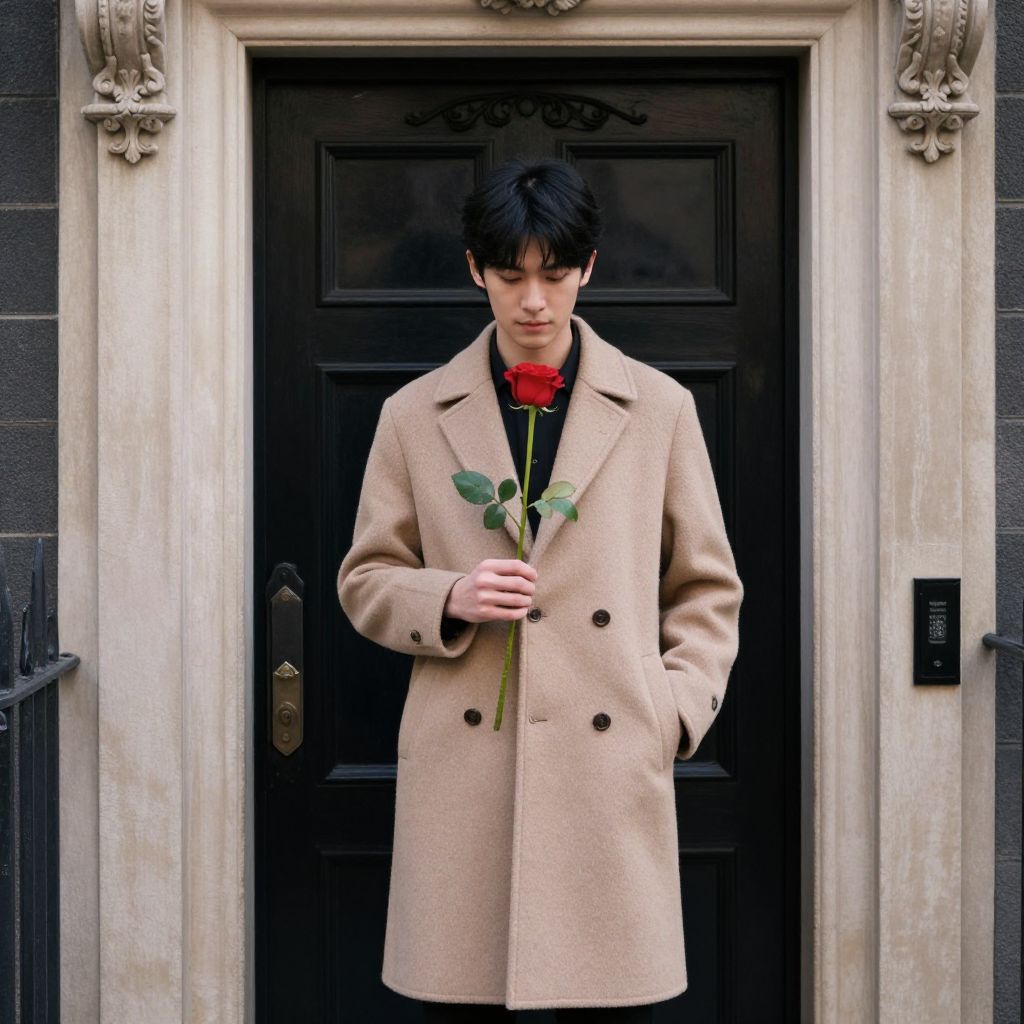 Photograph of a young Asian man with short black hair, wearing a beige coat, holding a red rose, standing in front of a black wooden door