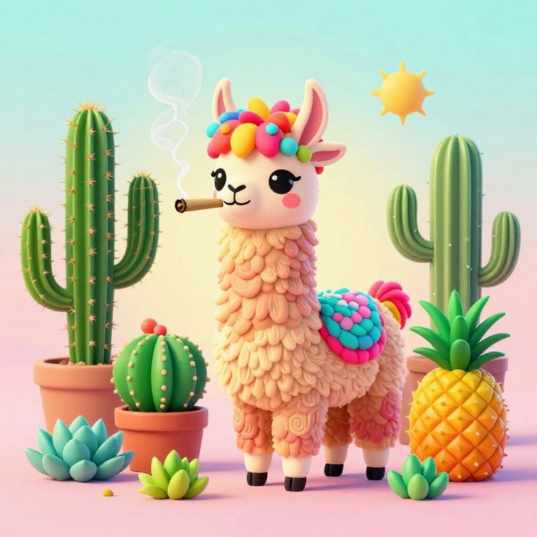 The image features a vibrant and whimsical character design of a chilled piñata llama smoking a joint, surrounded by an array of cannabis plants. The llama, depicted in a cute, chibi style, is adorned with a colorful, spiky mane and tail, and is seated in a pot with a decorative design. The surrounding plants include various types of cacti and succulents, each with distinct shapes and textures, such as the spiky topiary-like cactus and the round, plump pineapple-like plant. The overall composition is lively and colorful, with a mix of pastel and bright hues that create a playful and imaginative atmosphere. The plants are arranged in a way that frames the llama, creating a sense of depth and focus on the central character. The scene is set against a soft, gradient background, which enhances the overall whimsical and dreamy feel of the image.