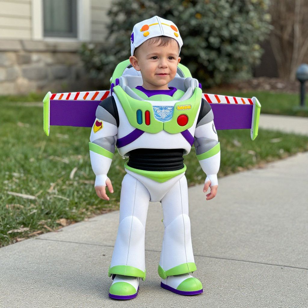 Photograph of a smiling toddler wearing a colorful Buzz Lightyear costume, standing on a concrete sidewalk with green grass and a house in the background.