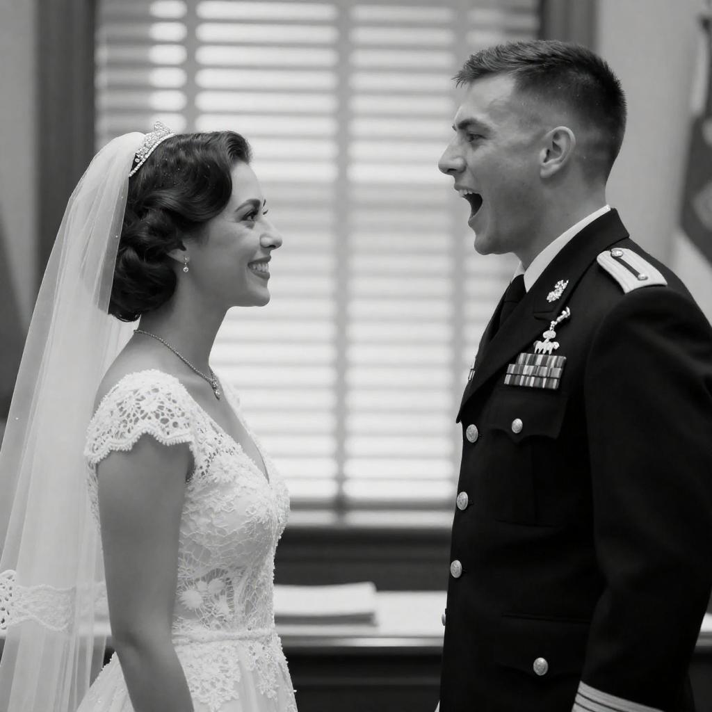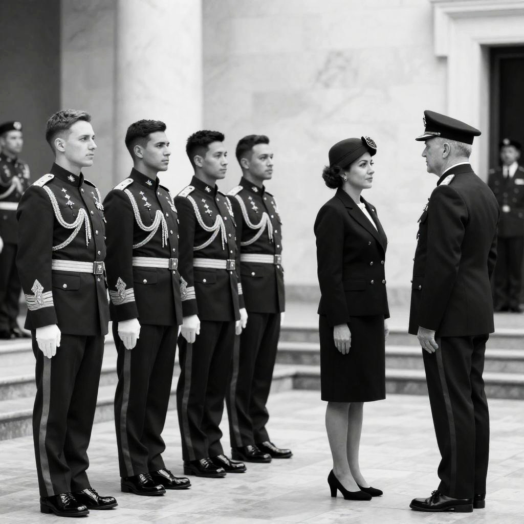 Black-and-white photograph of a formal military ceremony. Six men in dark, ornate military uniforms stand in a line on the left. A woman in a dark suit and hat stands on the right, facing an older man in a dark military uniform and cap. Background includes marble wall, stairs, and other men in formal attire. Woman and older man are engaged in conversation.