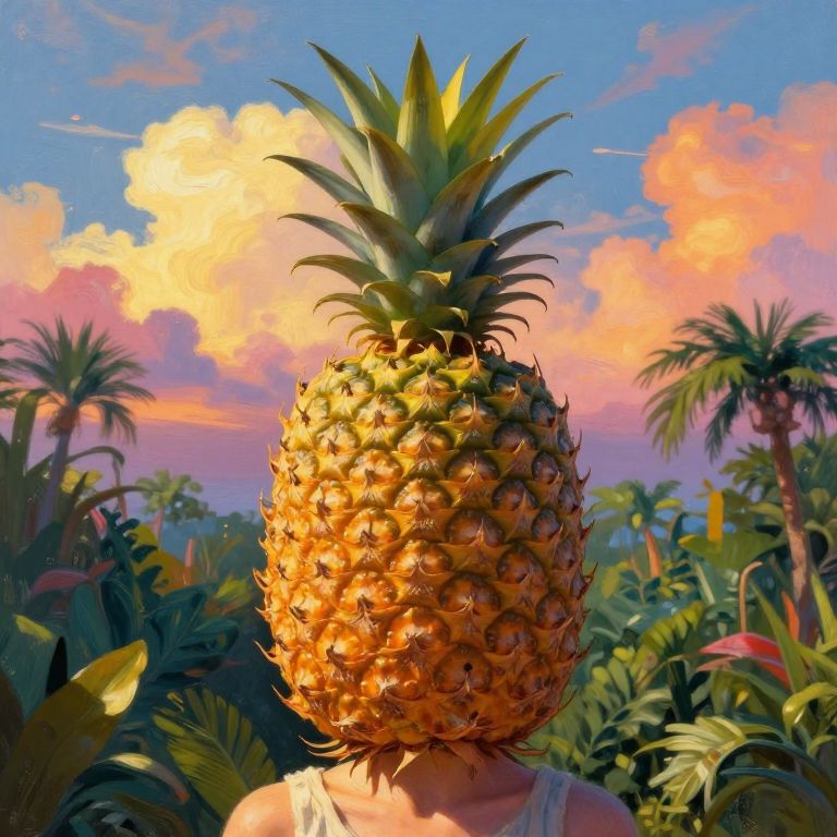 Closeup, giant pineapple as the head, girl surrounded by djungle, surreal photography, golden hour, colorful clouds, impressionist painting, digital painting, artstation, simon stalenhag
