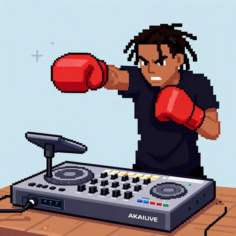Old-School a lightbrown-skinned boxer with locs, throwing a punch inside of an AKAI MPC 3000, MASCHINE MK3, MASCHINE MIKRO MK II, AKAI MPC LIVE II, hip-hop drum machine pixel art,