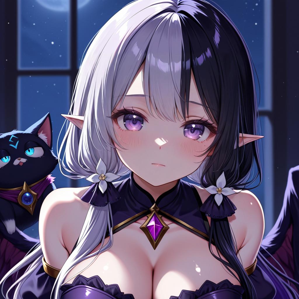 Digital artwork of a fantasy anime girl featuring split black and white long hair, purple eyes, and pointed elf-like ears. She wears a dark purple outfit with gold and gem embellishments, highlighting her cleavage and bare shoulders. Accompanied by a black cat with blue eyes, set against a moonlit night background visible through a window.