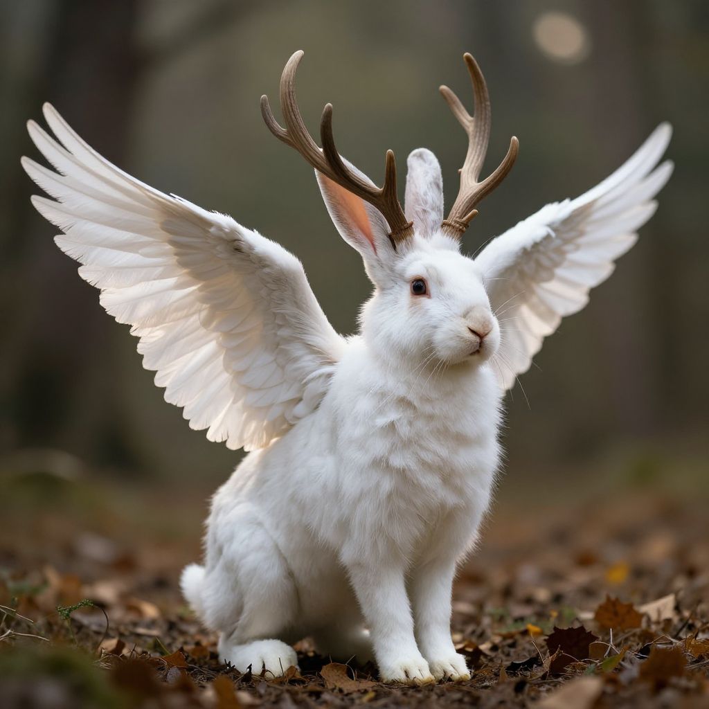 Rabbit with wings and antlers, elegant mythical animal, natural forest setting with fallen leaves, soft morning light, highly detailed feathers and antlers, photorealistic style