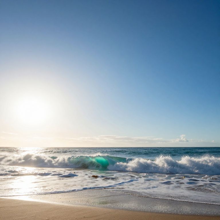 Minimalist Decor ultra-realistic image of waves crashing onto the beach, waves are coloured like the northern lights and the sun is beaming down, blue sky, low angle, photorealistic, 8k, uhd,