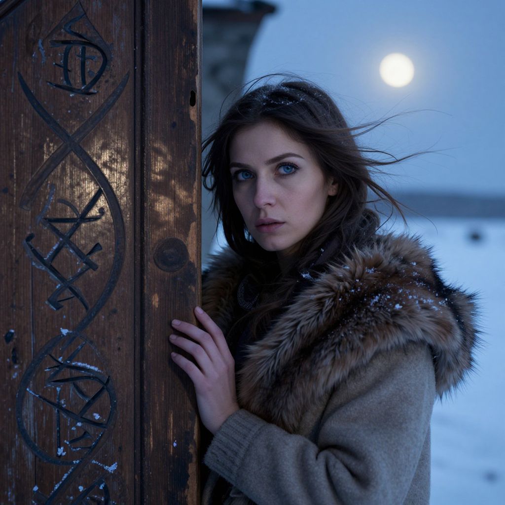 Envision a portrait photograph depicting an enigmatic Middle Eastern woman with striking blue eyes, her delicate features illuminated by soft moonlight filtering through ancient Norse runes carved into a weathered wooden door. Set against the desolate backdrop of a Scandinavian winter landscape, she stands resolute yet pensive, her fur-trimmed coat gently billowing in the icy wind. This ultra-realistic portrait exudes timeless beauty and an air of mystery, drawing viewers deeper into the secrets hidden within her captivating gaze. The juxtaposition of nature's cold austerity with the warmth of her expression creates an emotional spectrum that resonates with both vulnerability and strength.