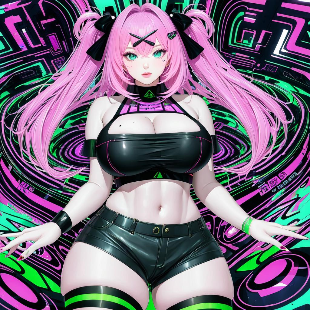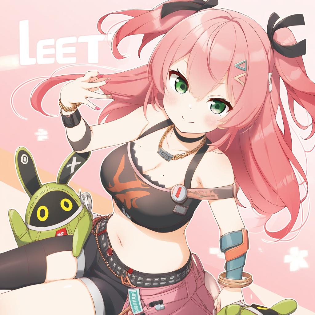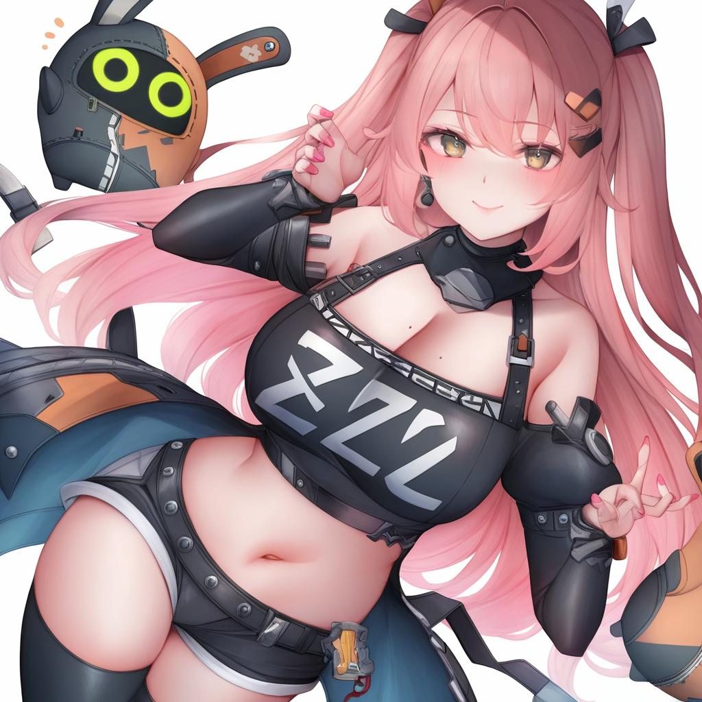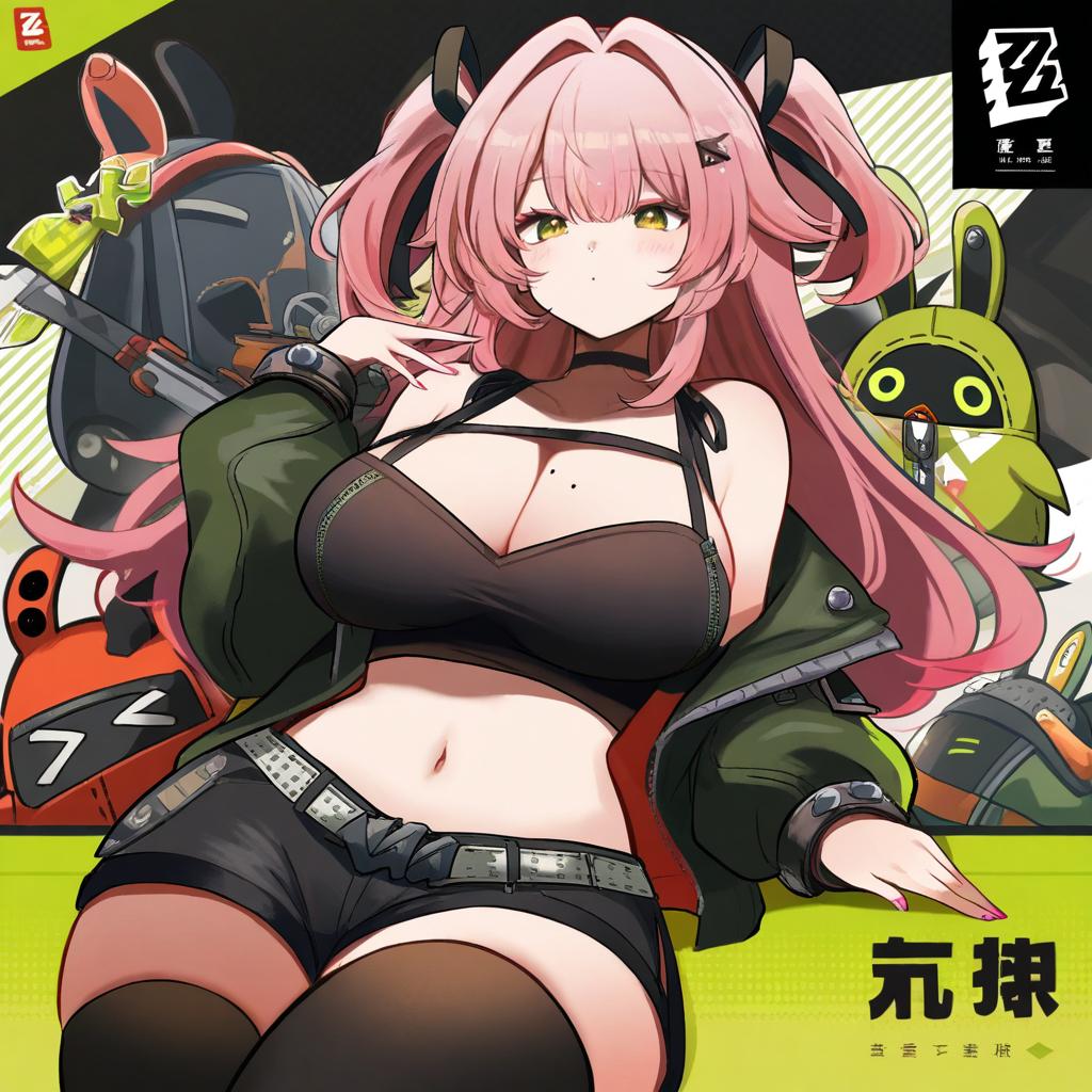 Amillion (zenless zone zero), zenless zone zero, 1girl, green eyes, mole under eye, pink hair, long hair, two side up, hair ribbon, hairclip, large breasts, mole on breast, cleavage, thighs, navel, black thighhighs, black shorts, black ribbon, bare shoulders, nail polish, pink nails, crop top, midriff, by artist zumi (zumidraws), animagine