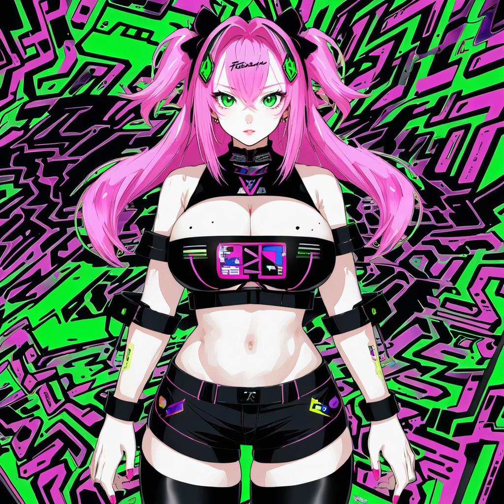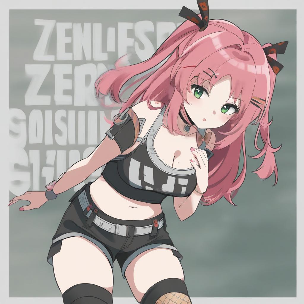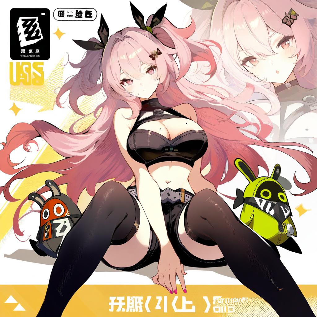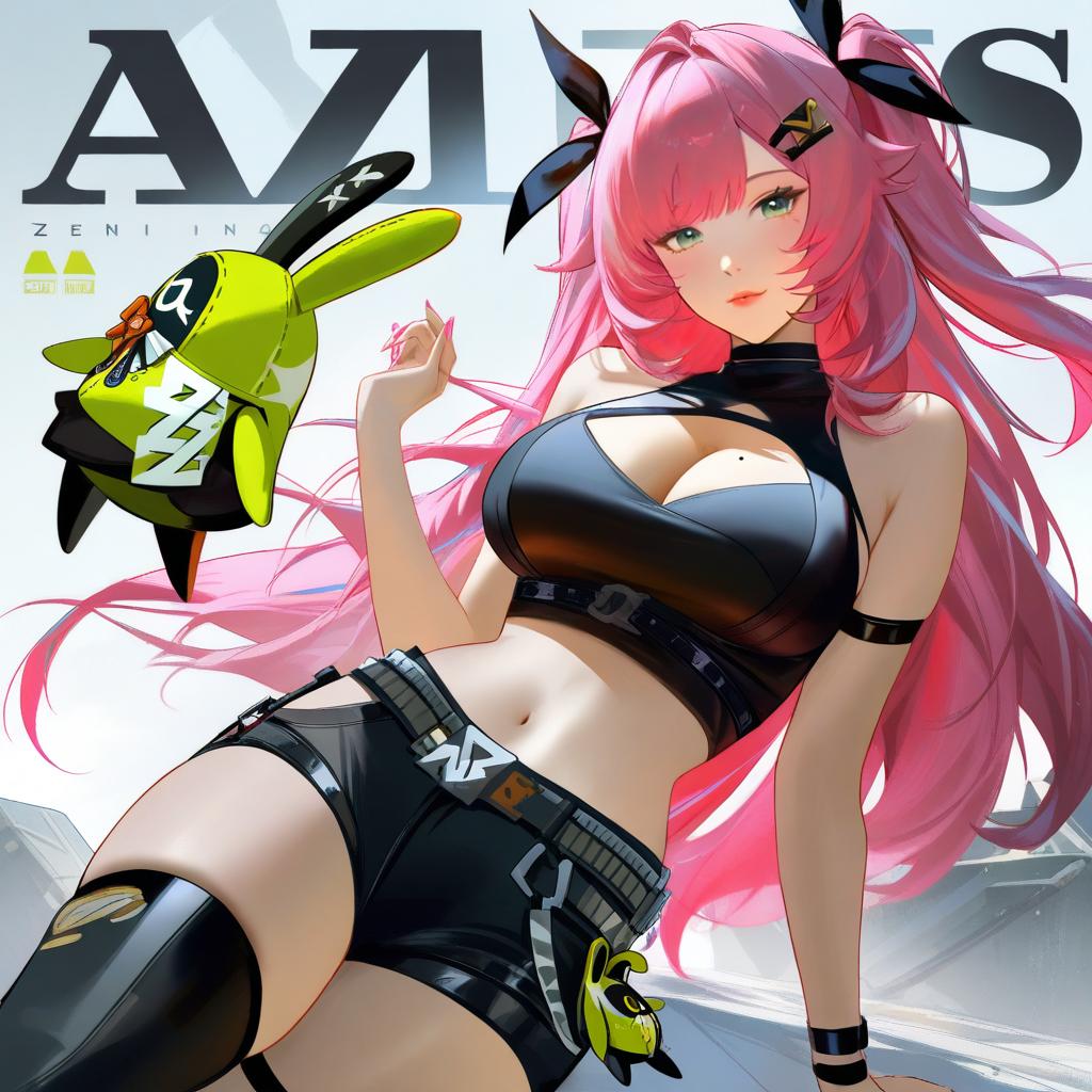 Amillion (zenless zone zero), zenless zone zero, 1girl, green eyes, mole under eye, pink hair, long hair, two side up, hair ribbon, hairclip, large breasts, mole on breast, cleavage, thighs, navel, black thighhighs, black shorts, black ribbon, bare shoulders, nail polish, pink nails, crop top, midriff, by artist zumi (zumidraws), animagine