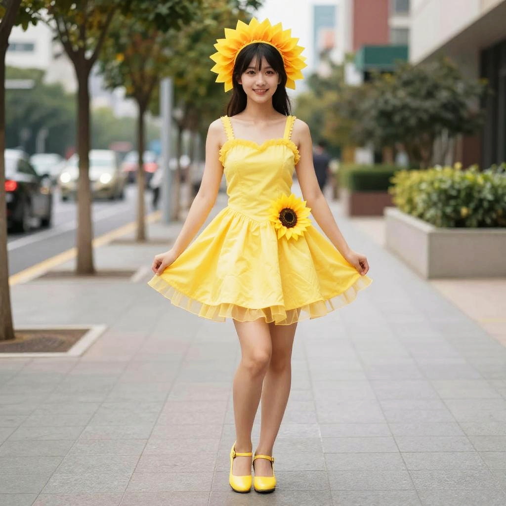 Sun Costume Fancy Dress, woman in yellow dress and sunflower headpiece standing on sidewalk