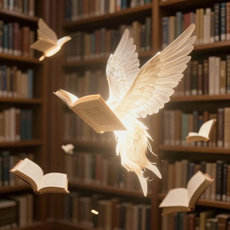 Photograph of glowing white angel with wings, mid-flight, surrounded by floating open books, in a dimly lit, wooden-shelved library.