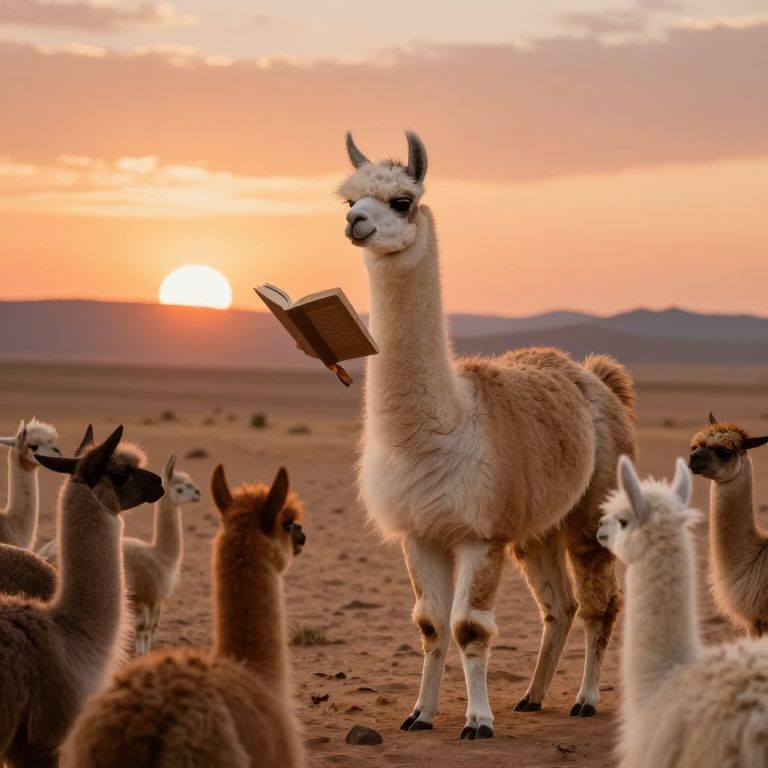 In a surreal desert sunset, a sentient llama stands upright, reading a book to a mesmerized audience of its kind, defying the boundaries of nature and imagination.