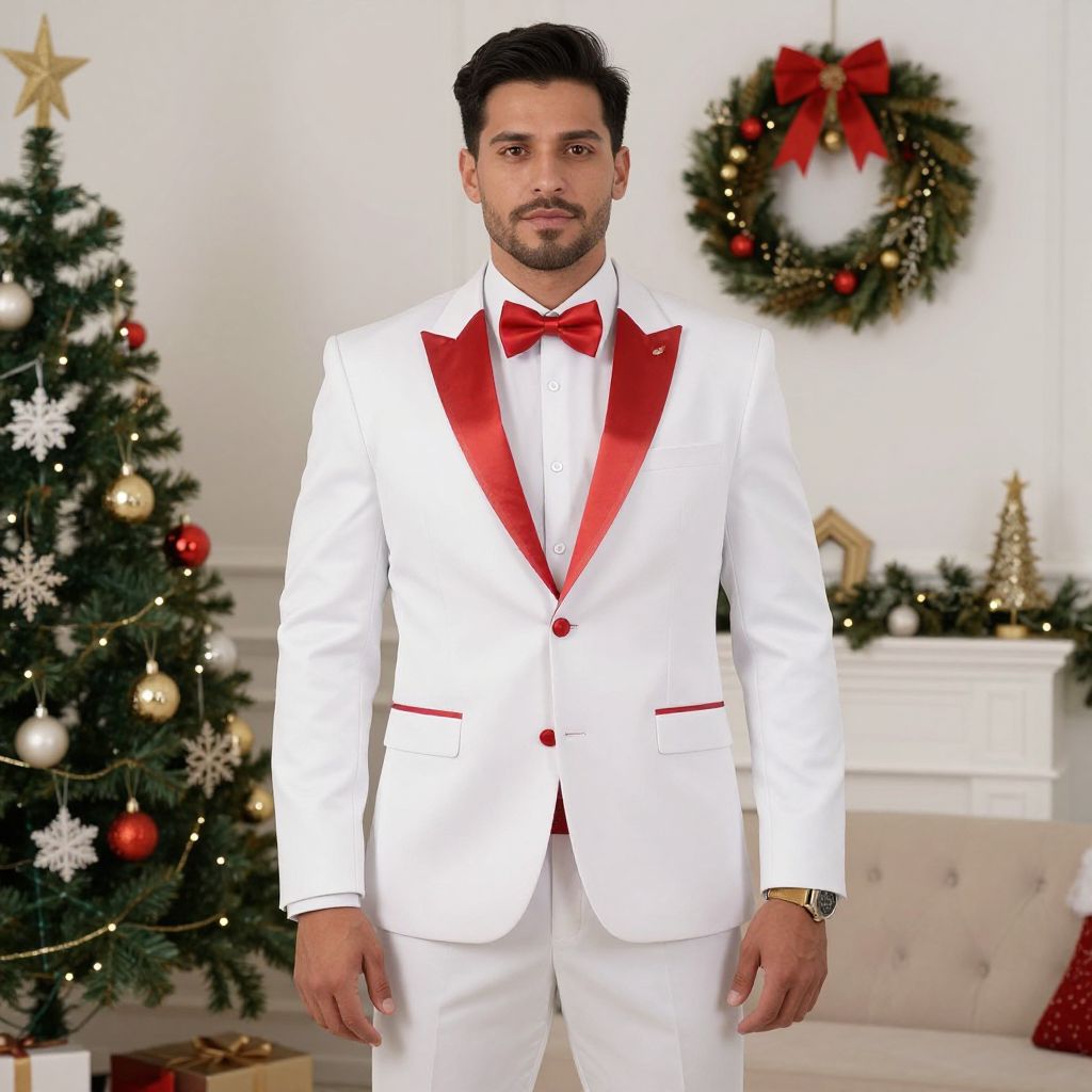 Light Christmas Suit Costume, dressed man in a suit standing in a room with a christmas wreath
