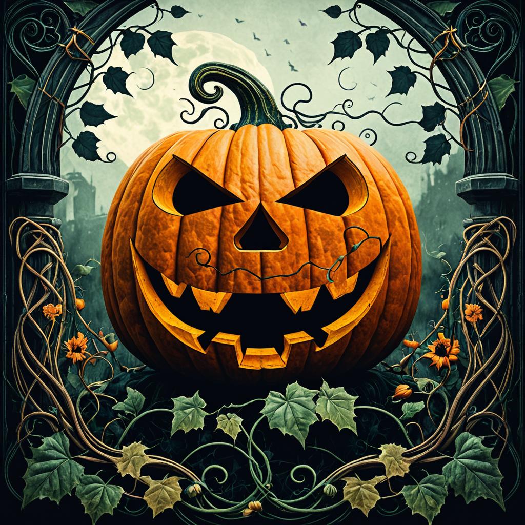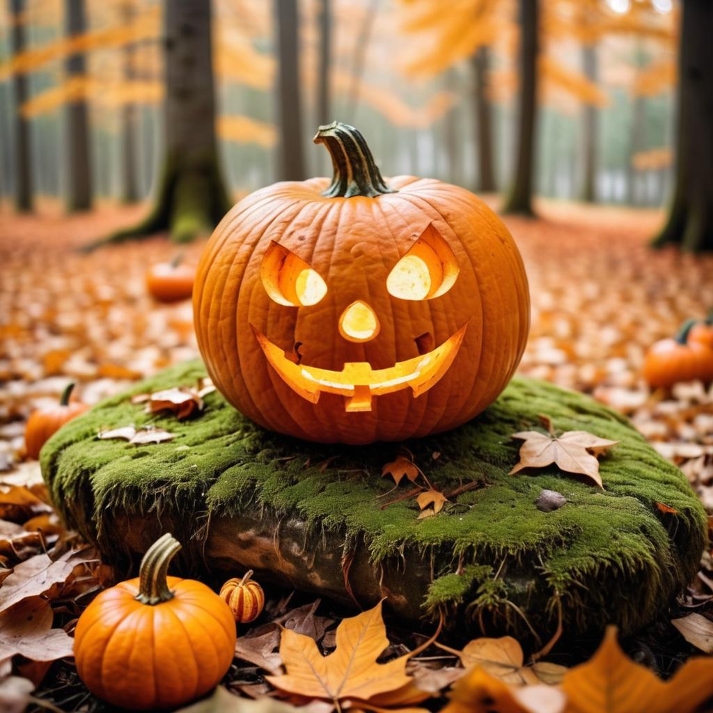 Carved Jack-o'-Lantern on Mossy Stone in Autumn Forest