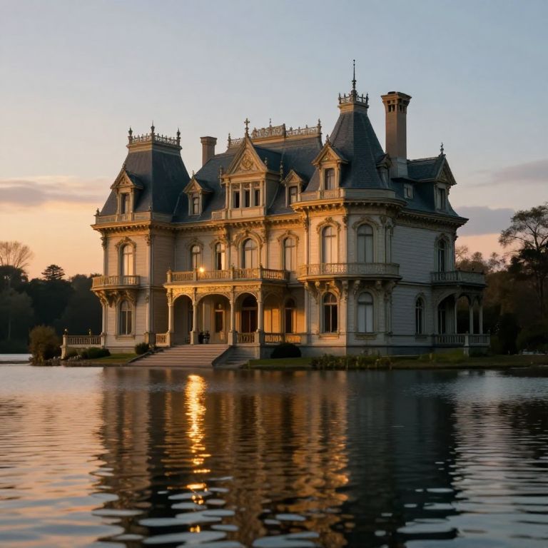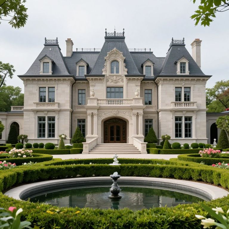 Majestic French-style chateau in Ontario, Canada, featuring a grand entrance with symmetrical steps, ornate stonework, and lush landscaping that includes manicured hedges, vibrant greenery, and a reflective pond in front, embodying the finest in French luxury homes.