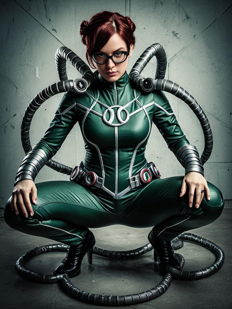 Woman in Doc Ock costume, cosplay festival portrait, realistic look