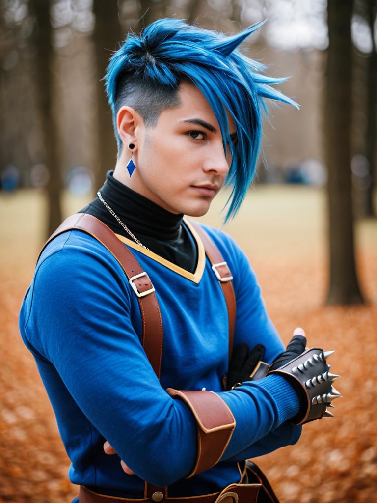 Photo-realistic close-up of a young male cosplayer dressed in a Camus (Dragon Quest 11) costume. He has vibrant blue spiked hair, blue eyes, and wears a blue turtleneck with brown straps and fingerless gloves featuring metal spikes. The image features natural lighting, warm tones, and soft background blur, highlighting realistic textures and vibrant colors.