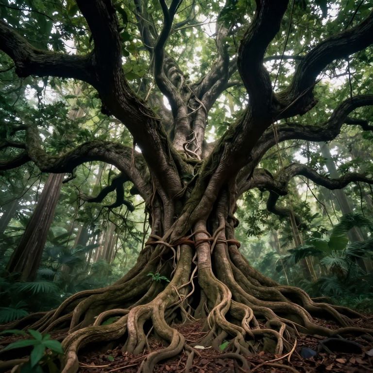 A massive, ancient tree with thick, twisted branches and sprawling roots in a dense, mystical forest. The tree's gnarled limbs extend outward and upward, surrounded by lush green foliage and a foggy, magical atmosphere, creating a sense of wonder and fantasy.