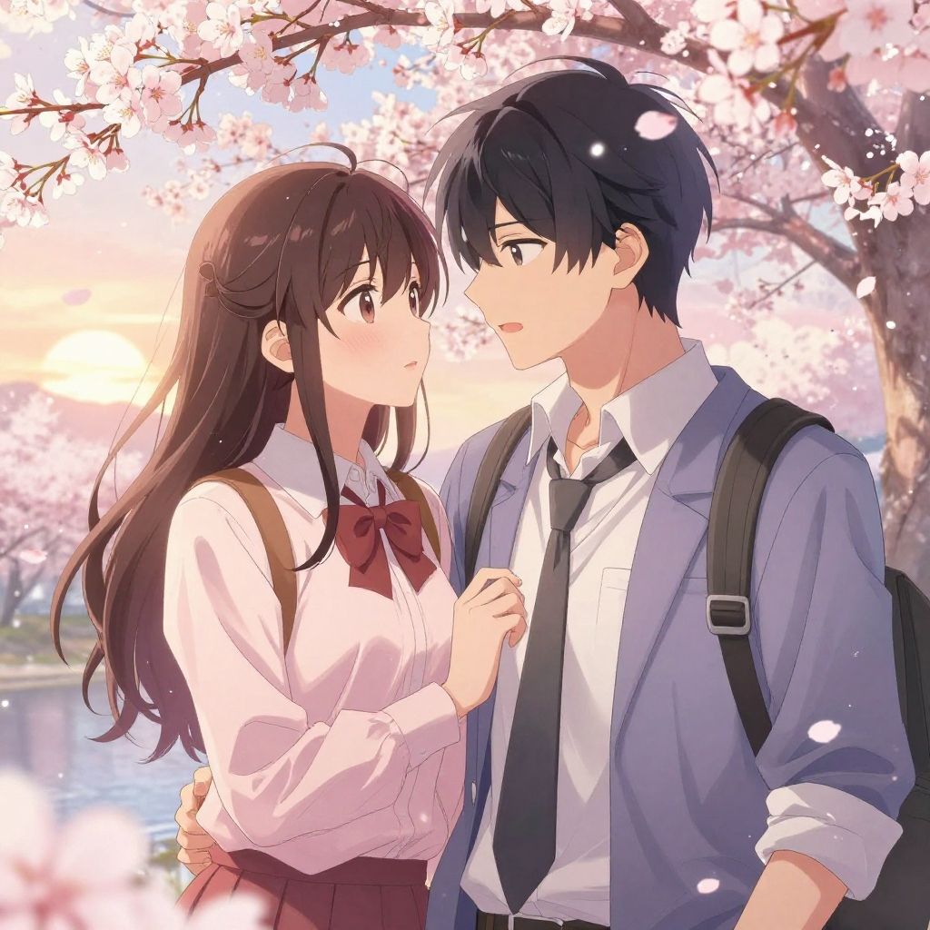 Visual novel online romantic moment under cherry blossoms at sunset, soft pastel palette, beautifully drawn characters, intricate details, emotional and heartfelt scene