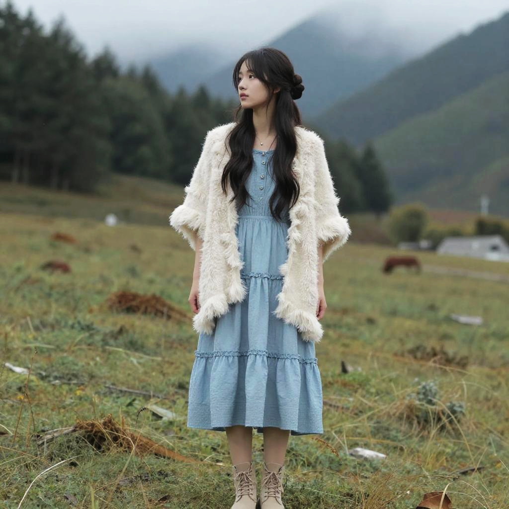 Photograph of a young woman with long, dark hair standing in a grassy mountain field. She's wearing a light blue, layered dress with a fluffy, cream-colored shawl and beige boots. Her hair is styled in a loose bun. The background shows a blurred, green forest and misty mountains. She looks off to the side with a serene expression. The overall vibe is rustic and ethereal.
