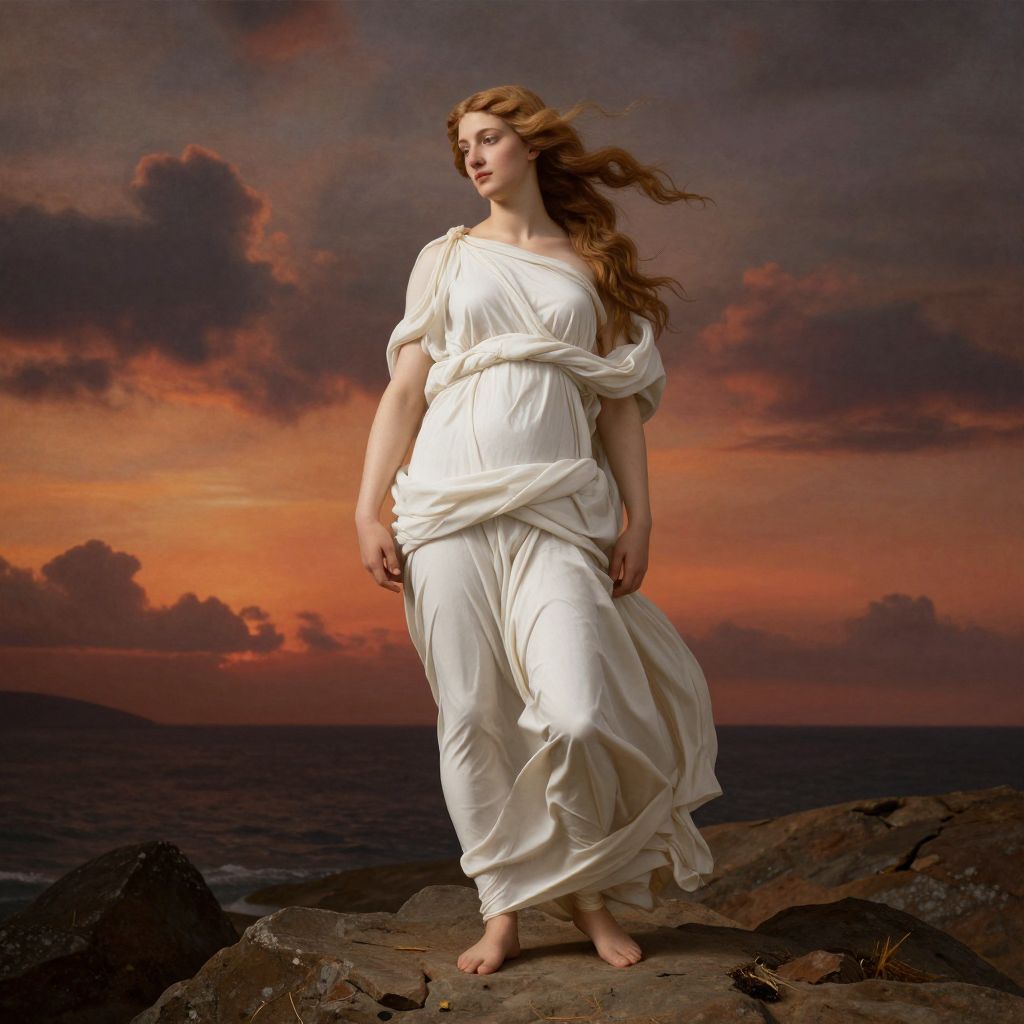 A classical digital artwork reminiscent of Renaissance paintings, featuring a woman draped in flowing white fabric standing on a rocky shore, her hair billowing in the wind against a dramatic sunset sky, evoking the timeless beauty and mythological essence of \"The Birth of Venus.\