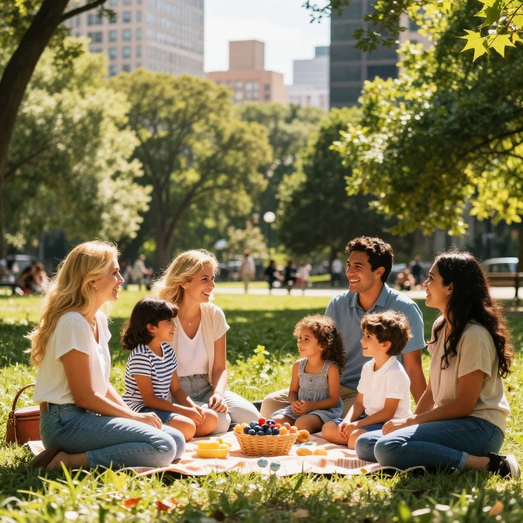 Blond Hispanic family having a picnic in a lush city park, diverse ages, joyful mood, bright sunlight and gentle breeze, highly detailed foliage and clothing, candid composition, vibrant color palette, hyper-realistic style