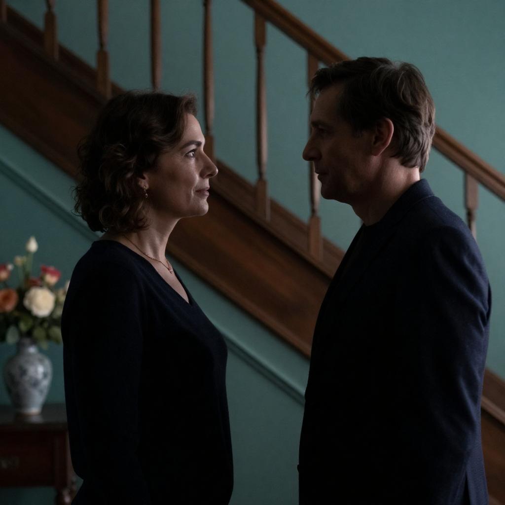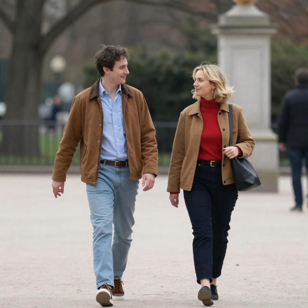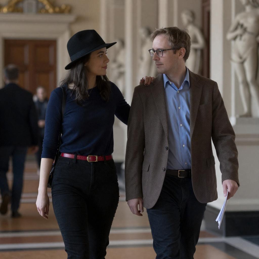Photograph of two people walking through a grand, ornate hallway. The woman on the left has dark hair, wears a black hat, dark blue long-sleeve top, and a red belt, with her arm around the man's shoulder. The man on the right has light brown hair, wears glasses, a brown blazer, blue shirt, and dark pants, holding a paper. Background includes architectural details, statues, and people walking. Intimate, relaxed interaction, looking at each other.