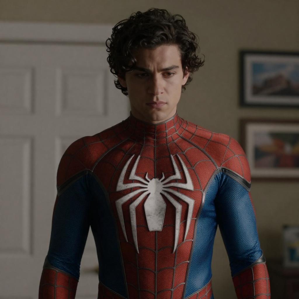 Photograph of a young man with dark, wavy hair wearing a red and blue Spider-Man costume with a white spider emblem on his chest. He stands in a dimly lit room with a white door and framed pictures on the wall. His facial expression is serious and downward-looking. The lighting casts shadows on his face.