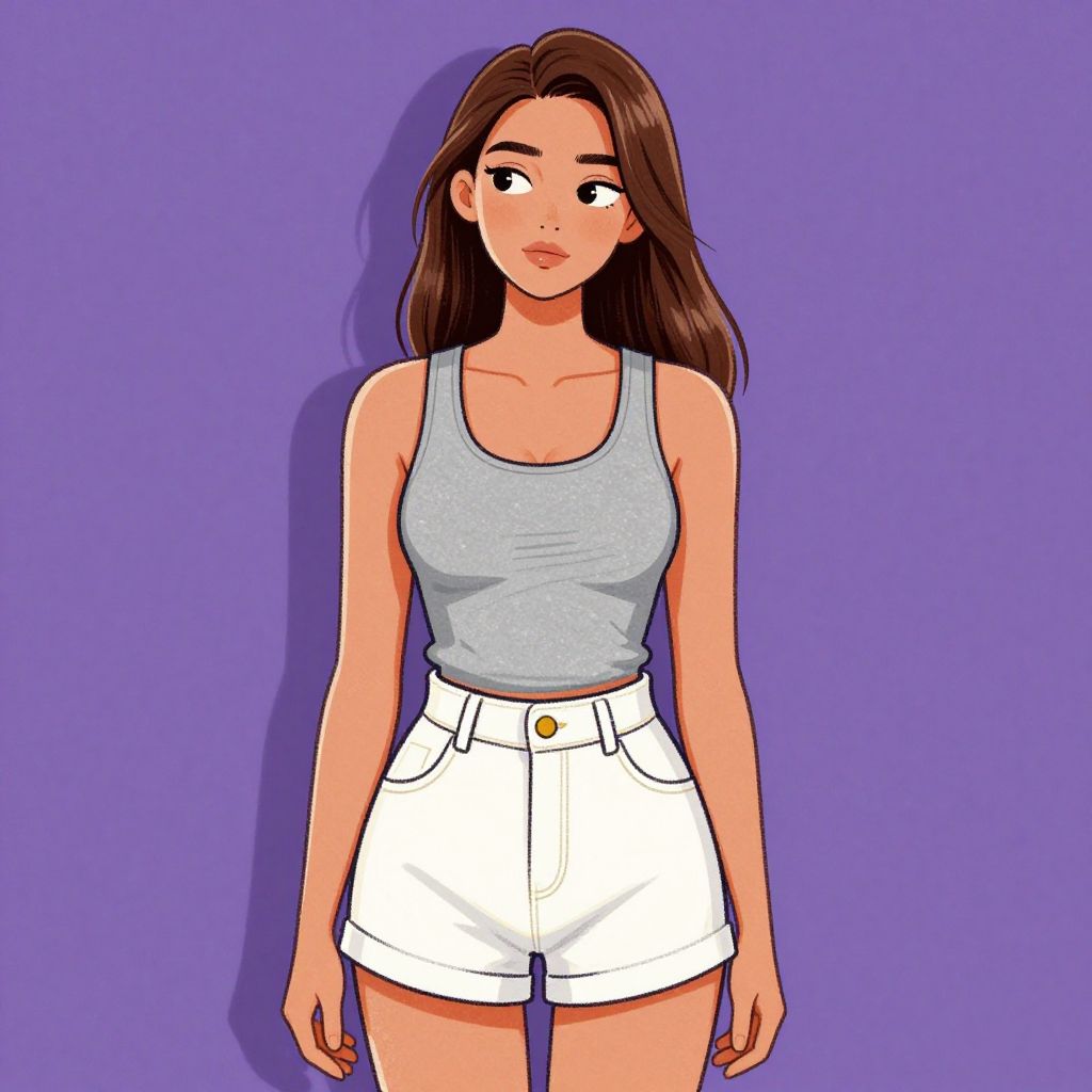 This digital illustration depicts a young woman with light olive skin, straight brown hair, and brown eyes. She wears a gray, form-fitting tank top and high-waisted, white shorts with a gold button. Her expression is neutral, with a slight blush on her cheeks. She stands against a solid purple background, casting a subtle shadow to her left. The style is vibrant and cartoonish, with clean lines and flat colors, emphasizing her casual, summer outfit. The woman's body is slightly angled to the right, and her arms hang relaxed by her sides.