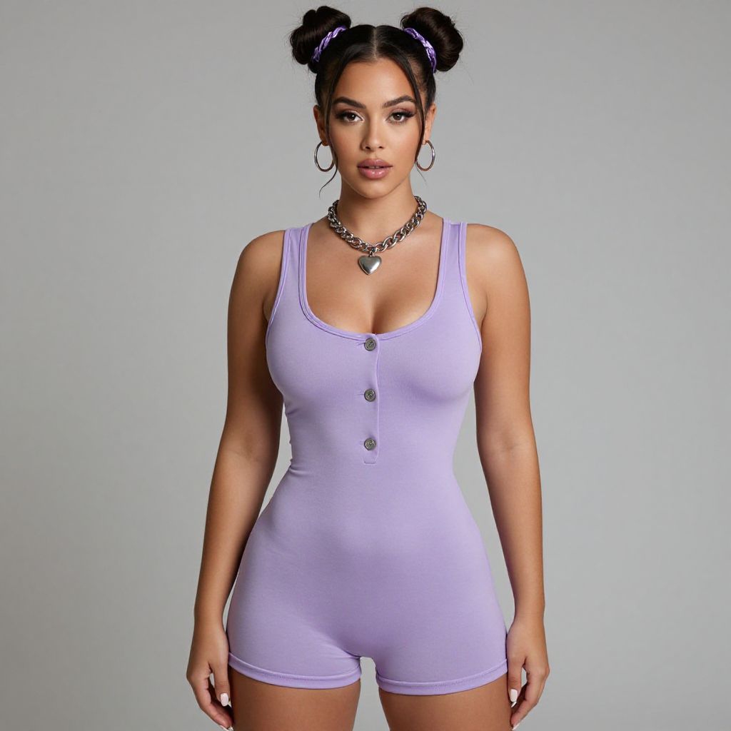"Woman, contemporary streetwear, lilac romper with snap button front, scoop neckline, sleeveless, fitted waist, short hemline, chunky silver chain necklace, heart pendant, hoop earrings, dual hair buns with wrapped bases, neutral studio background.. Sexy. Pretty face and beаutiful eyes. Big breasts."
