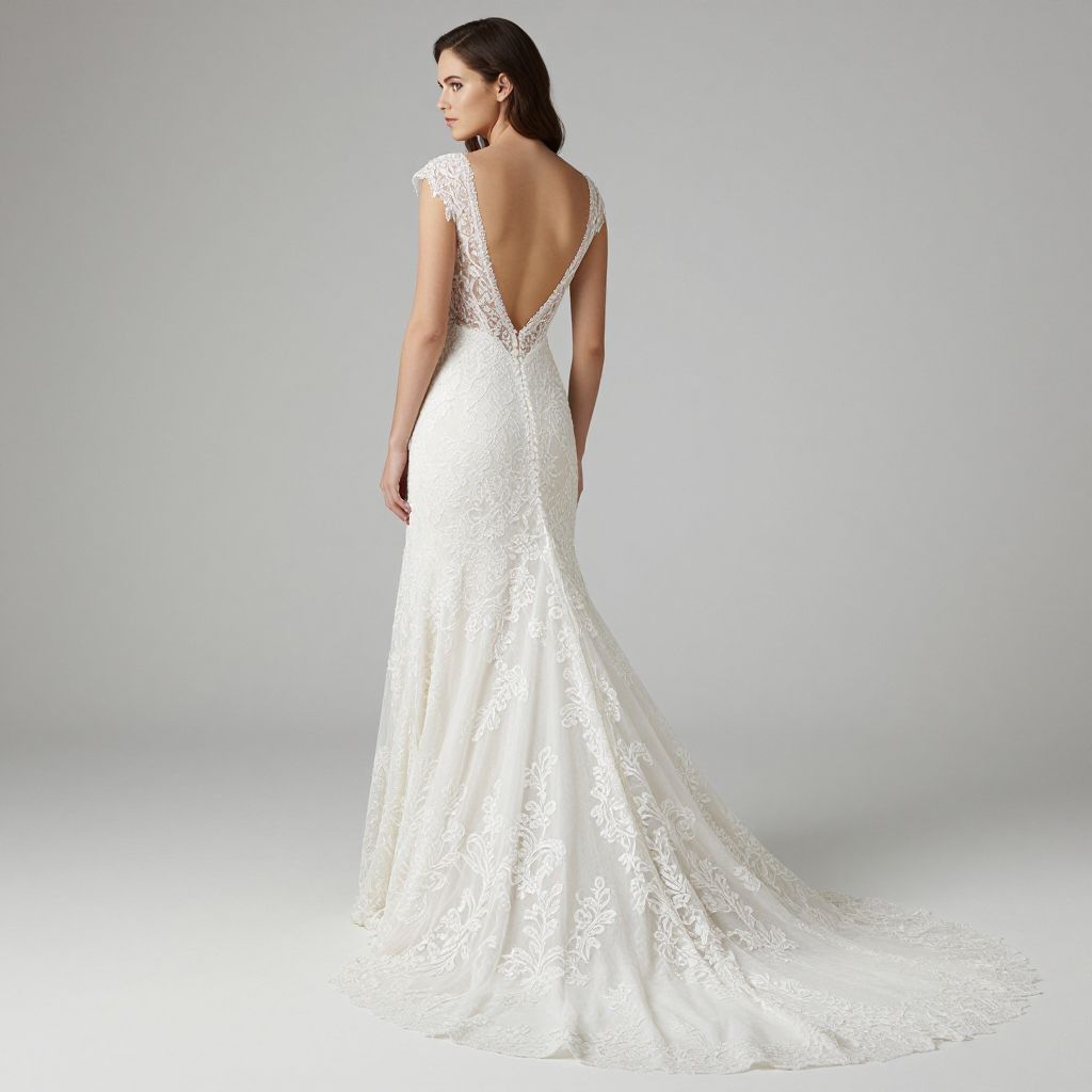 Elegant bridal gown featuring a low back design with intricate lace detailing, showcasing a modern bohemian style with a flowing silhouette and a subtle train.