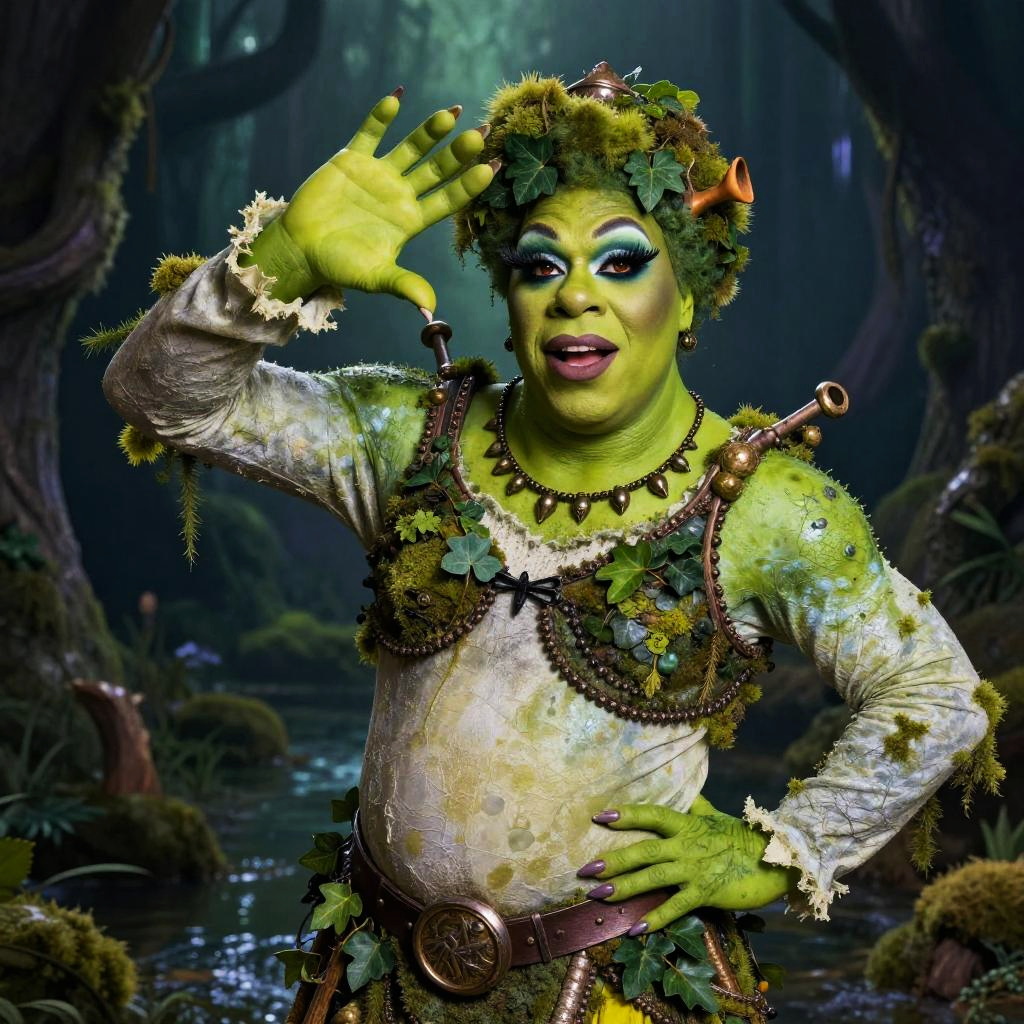 Fantasy portrait of Shrek drag persona, emerald green skin with intricate face paint resembling swamp foliage, voluminous hair styled in an avant-garde fashion, surrounded by glowing fireflies and mystical fog, ethereal atmosphere, vibrant color palette.
