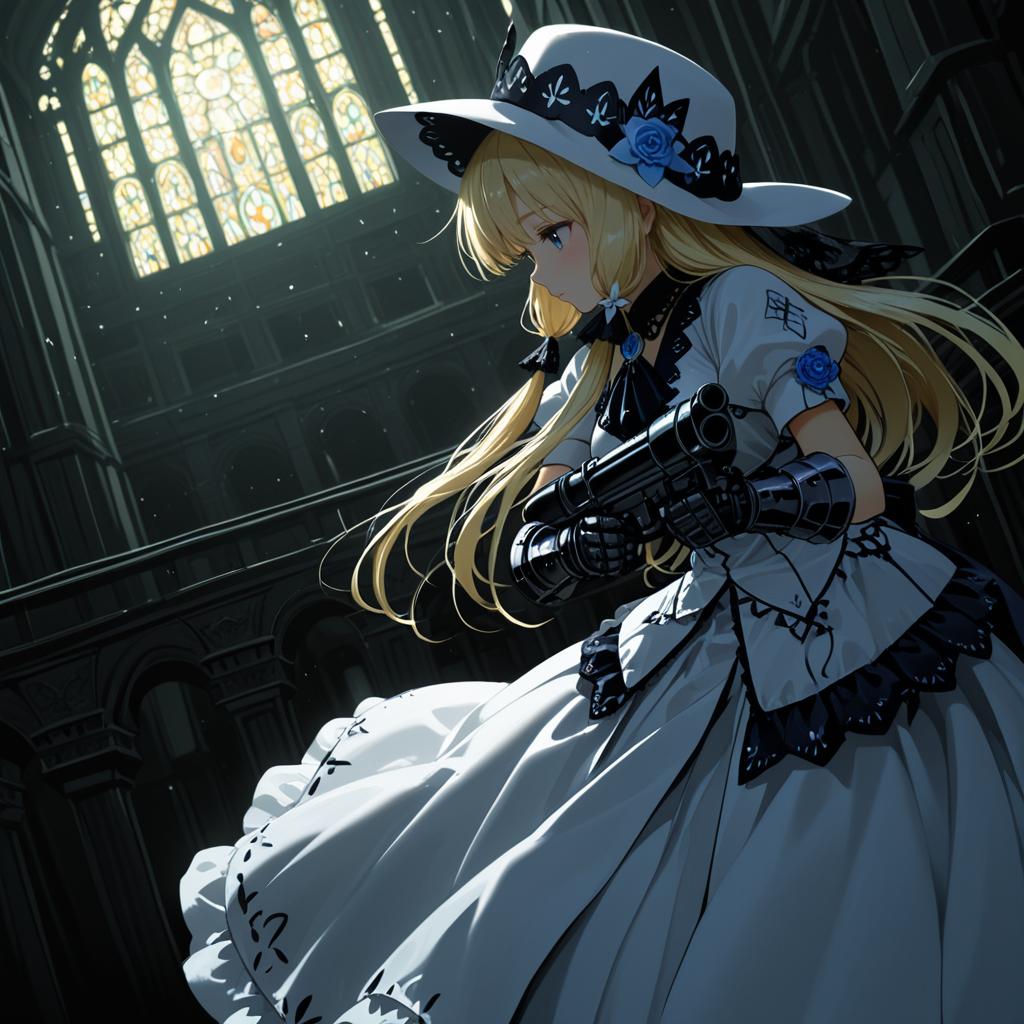 Gunner 2 (sekaiju), sekaiju no meikyuu, 1girl, blue eyes, blonde hair, long hair, hat, by artist suna (s73d), dark_illustrious