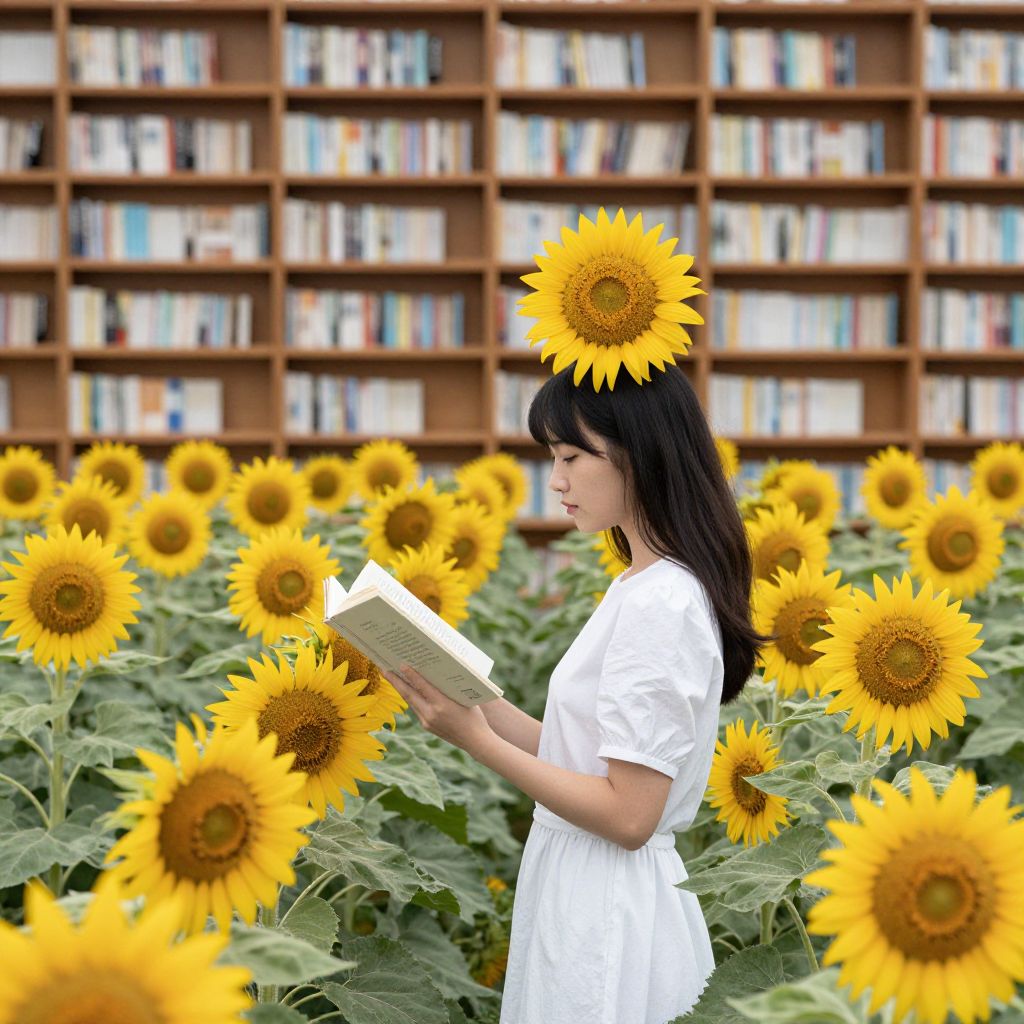 Photograph of an Asian woman with straight black hair standing in a sunflower field, wearing a white short-sleeved dress. She is focused on a book in her hands. Bright yellow sunflowers surround her, with one sunflower placed digitally on her head. In the background, there is a large, grid-like wooden bookshelf filled with colorful books. The image has a surreal quality due to the digitally added sunflower on her head. The overall setting is bright and cheerful, with a mix of natural and surreal elements.