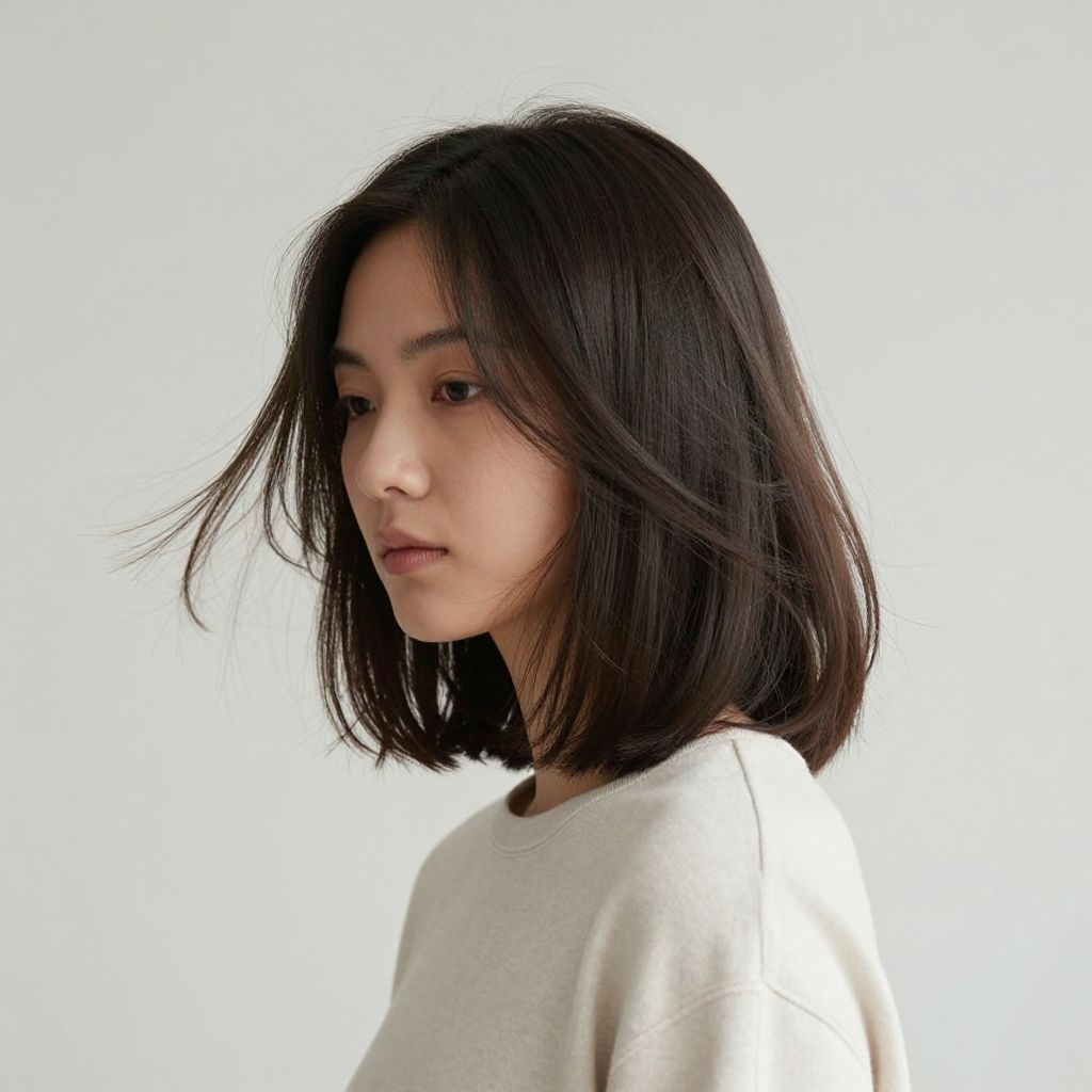 Woman with semi-long layered crop hairstyle posing in a minimalist studio, neutral tones, natural lighting, clean background, elegant close-up, soft shadows, focus on hair texture and volume, modern aesthetic, studio portrait style.