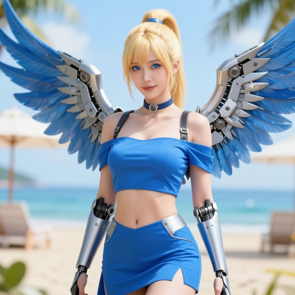 Mercy, sexy, off the shoulder top, skirt, blue outfit colour, blue eyes, blonde hair, high ponytail, mechanical wings, summer_background, best quality, rendering, photorealistic, highly detailed portrait, cute environment, summer vibes