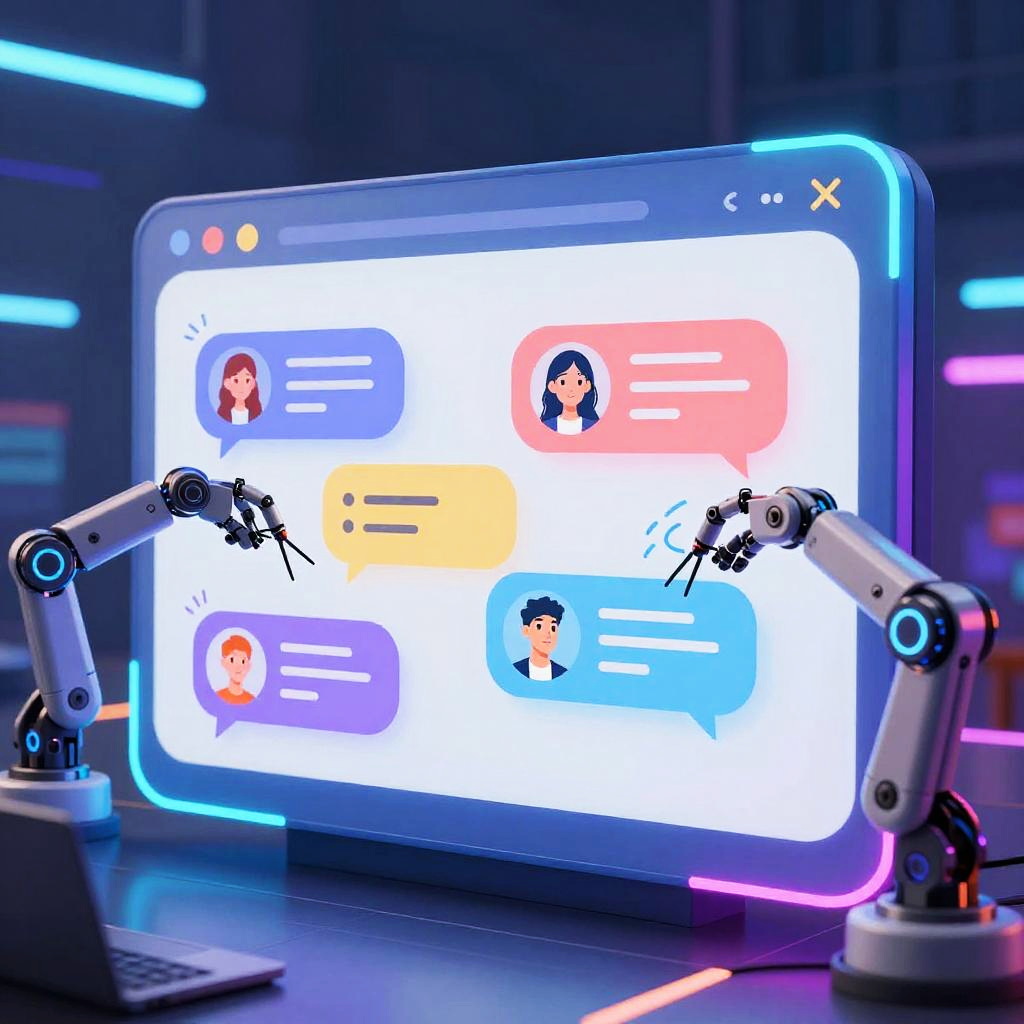 Discord AI drawing of a futuristic chat interface glowing with neon lights, sleek robotic arms sketching digital avatars mid-conversation, vibrant colors and dynamic lines illustrating the blend of technology and creativity in real-time communication.