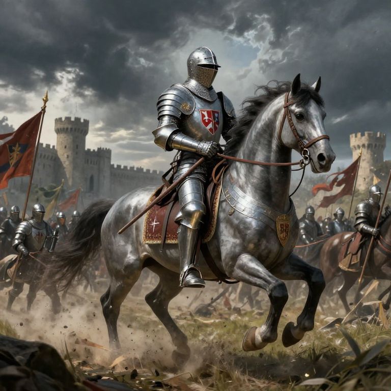 Digital artwork of a knight in shiny silver armor, riding a galloping black horse, amidst a battle with a castle backdrop.