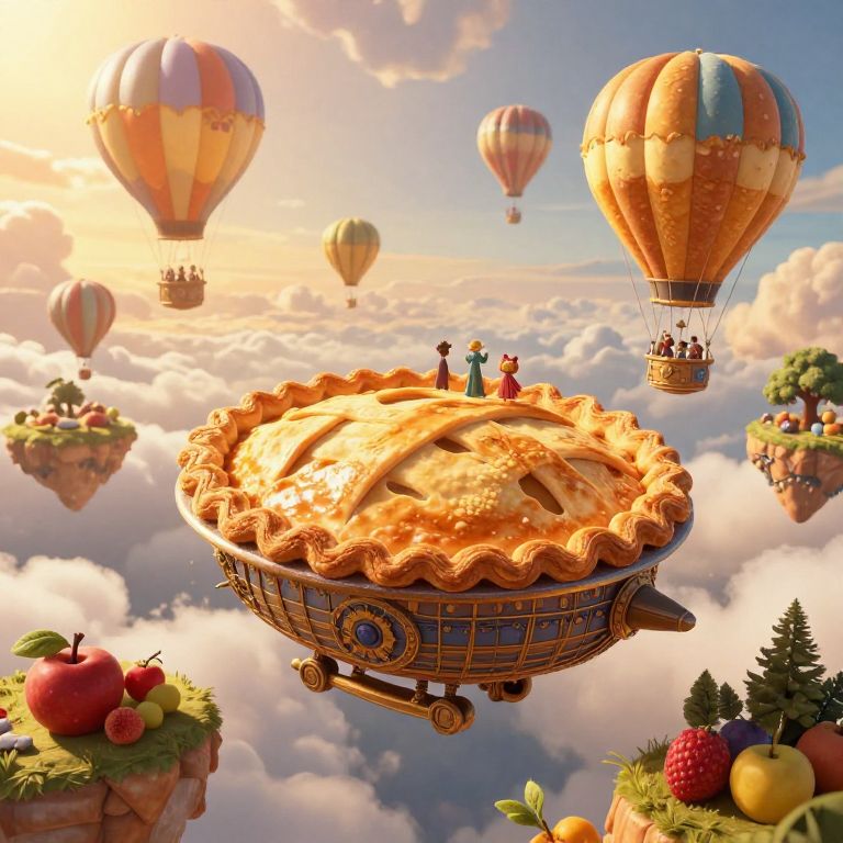 Floating towards pie, a whimsical steampunk airship journey with characters drifting in hot air balloons made of pie crusts, golden sunlight filtering through fluffy clouds, surreal details of floating orchard fruits and pastry islands, richly textured and vibrant colors.