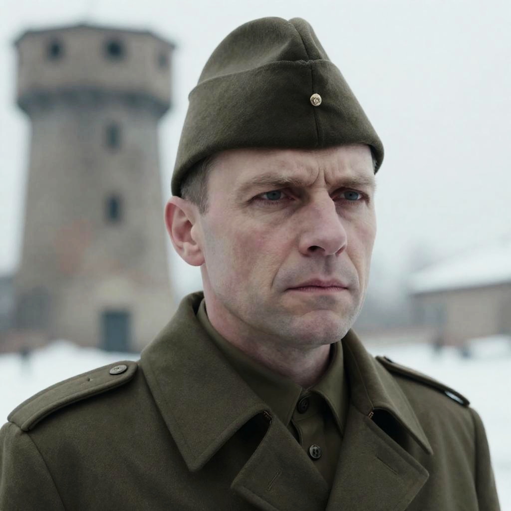 Close-up of a middle-aged man with pale skin, serious expression, wearing a dark military-style cap and coat. Background includes a blurred, weathered tower and snowy landscape. His face is centered, eyes looking slightly to the right.
